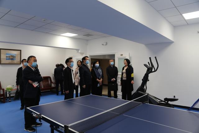 调研团队一行来到外文楼工会之家进行实地考察。作为北京市总工会“模范职工小家”,在本次外文楼、民主楼修缮过程中,外院同步进行了“工会之家”建设规划,特别设计使用运动场馆专用灯光,乒乓球比赛专用地面,配置了开水间、更衣室、淋浴间等必备设施,吸引了全院教职员工积极参加工会活动。同时加强楼宇文化建设,配合外文楼、民主楼装修风格,在内部布置、墙面装饰等细节处下功夫,营造百年外语学府独有的文化氛围,体现北大外院人“学贯中西,道通古今”的精神追求。