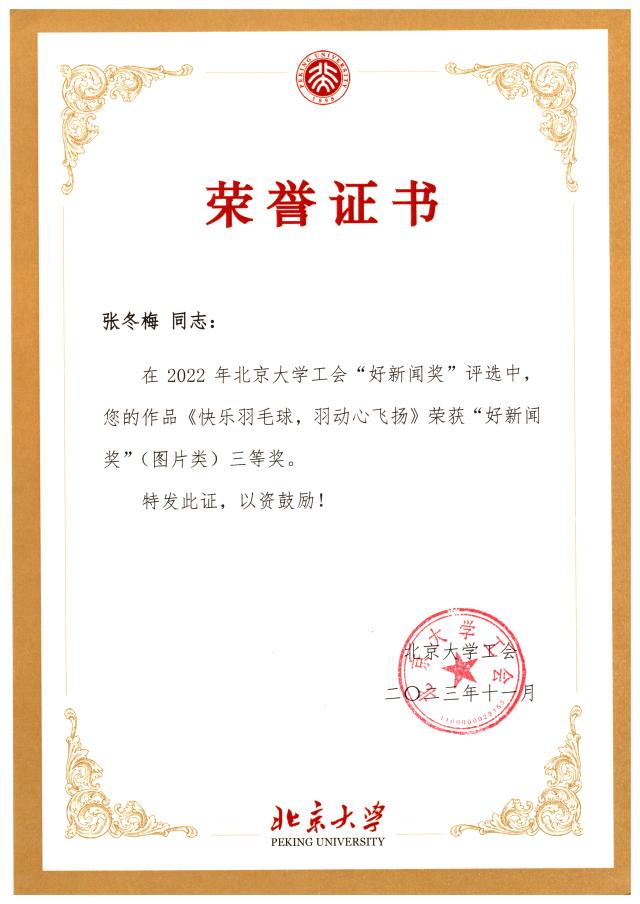 外国语学院工会多位老师获得好新闻奖:外院工会主席张冬梅老师的《快乐羽毛球——羽动心飞扬》荣获图片类三等奖、工会常务副主席倪丽慧老师的《全国总工会党组成员谭天星一行来外院调研》荣获文字类二等奖、工会会员苏晓老师的《我为师生办实事——外国语学院召开行政工会小组业务交流会》荣获文字类二等奖、苏晓老师的《同心勠力——鼓舞心齐》荣获图片类二等奖。恭喜几位老师在北京大学工会“好新闻奖”评选中取得好成绩!