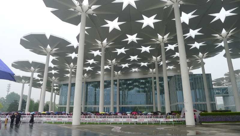 另有一些老师选择去国际馆参观。国际馆由94把巨型花伞构成,如同一片白色的花海飘落园区,且与游客手中的各色雨伞动静结合、相映成趣。这些擎天花伞不仅美观奇特,在这风雨交加的时刻,还能为我们遮风挡雨。据说,花伞的立柱可收集屋面雨水,使其渗入蓄水池。当雨水过多时,将会流入排水沟,用于景观用水、绿化用水、路面冲洗等。