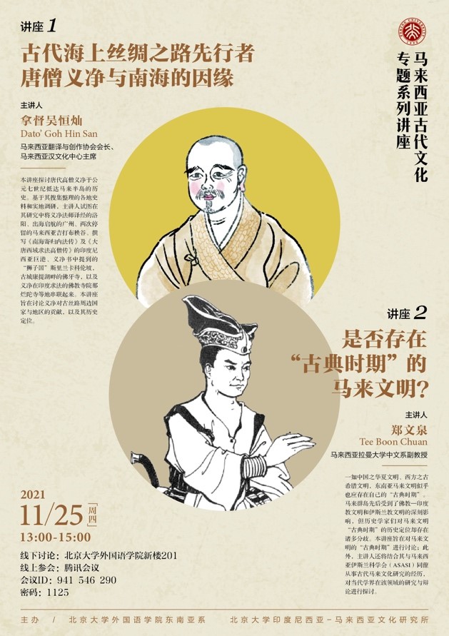 2021年11月25日,新利·体育,新利(中国)官方东南亚系、印度尼西亚—马来西亚文化研究所举办了马来西亚古代文化专题系列讲座“古代海上丝绸之路先行者唐僧义净与南海的因缘”和“是否存在‘古典时期’的马来文明?”。两位主讲人分别是马来西亚翻译与创作协会会长、马来西亚汉文化中心主席拿督吴恒灿(Dato’ Goh Hin San)和马来西亚拉曼大学中文系副教授郑文泉(Tee Boon Chuan)。讲座以线上线下结合的方式进行,由外国语学院东南亚系谢侃侃助理教授主持,东南亚系罗杰副教授作为与谈人参与了讨论。