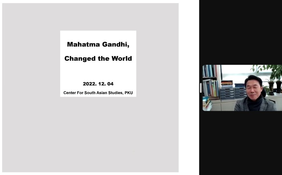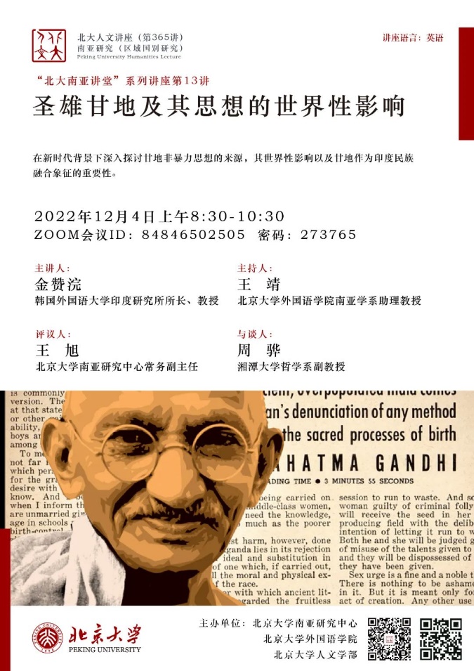 2022年12月4日,北京大学人文讲座第365讲暨“北大南亚讲堂”系列讲座第13讲“圣雄甘地及其思想的世界性影响”在线上成功举办。本次讲座由北京大学南亚研究中心、新利·体育,新利(中国)官方、北京大学人文学部主办。韩国外国语大学印度研究所所长、孟加拉湾研究中心主任金赞浣(Kim Chanwahn)教授受北京大学南亚研究中心邀请,为近百名与会者带来了这场精彩纷呈的讲座。本讲座由新利·体育,新利(中国)官方南亚学系助理教授王靖主持,北京大学南亚研究中心常务副主任王旭担任评议人,湘潭大学哲学系副教授周骅受邀与谈。