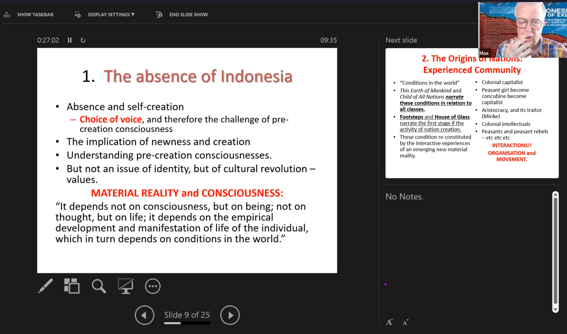 在第二场讲座中,雷恩博士结合自己的新书《走出流放的印度尼西亚》( Indonesia Out of Exile )论述了印尼作家普拉姆迪亚的“布鲁岛四部曲”在印尼政治历程、青年群体意识觉醒等方面的巨大贡献。他指出,“新秩序”政权黑色宣传运动的本质为反左翼,而普拉姆迪亚所创作的“布鲁岛四部曲”对苏哈托政府所主导的宣传话语体系造成了巨大的冲击,并成功激发起印尼青年研究左翼历史的兴趣。