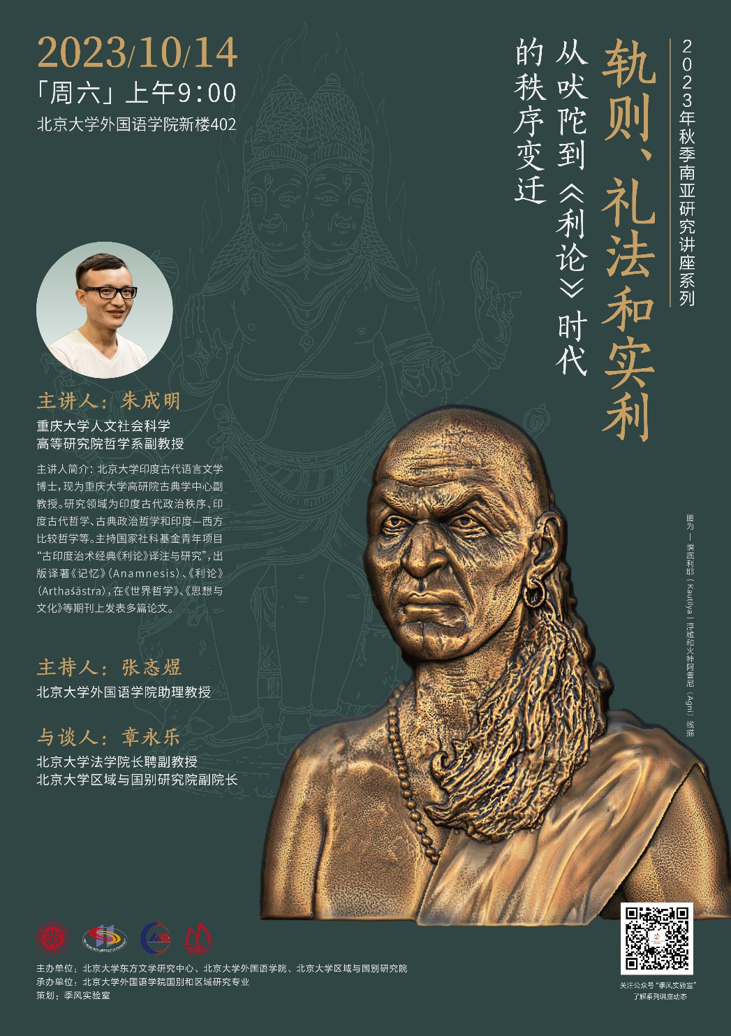 2023年10月14日上午,重庆大学人文社会科学高等研究院哲学系朱成明副教授应邀为我校师生进行题为“轨则、礼法和实利:从吠陀到《利论》时代的秩序变迁”的讲座。本次讲座是由北京大学东方文学研究中心、外国语学院和区域与国别研究院主办,外国语学院国别和区域研究专业承办的2023年秋季学期南亚研究系列讲座的第一讲。本场讲座由外国语学院张忞煜助理教授主持,北京大学法学院长聘副教授、北京大学区域与国别研究院副院长章永乐以及华侨大学华侨华人与区域国别研究院研究员冯立冰出席并参与讨论。