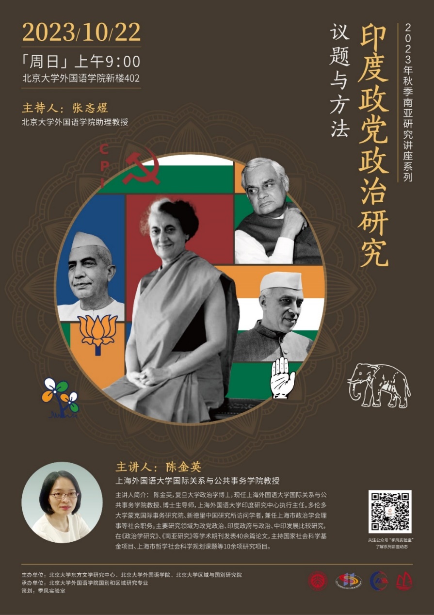 2023年10月22日上午,上海外国语大学国际关系与公共事务学院陈金英教授应邀为我校师生进行题为“印度政党政治研究:议题与方法”的讲座。本次讲座是由北京大学东方文学研究中心、外国语学院和区域与国别研究院主办,外国语学院国别和区域研究专业承办的2023年秋季学期南亚研究系列讲座的第三讲。本场讲座由外国语学院张忞煜助理教授主持,中国社会科学院民族学与人类学研究所副研究员吴晓黎出席本次讲座并参与讨论。