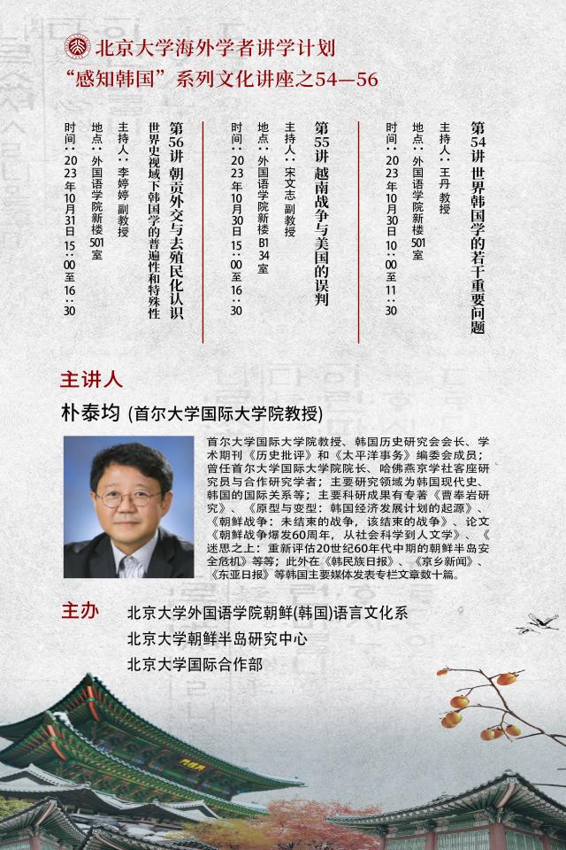 2023年10月30日至31日,受“北京大学海外学者讲学计划”支持,由新利·体育,新利(中国)官方朝鲜(韩国)语言文化系、北京大学朝鲜半岛研究中心、北京大学国际合作部共同主办的“感知韩国”系列讲座第五十四至五十六讲在外院新楼成功举办。三场讲座主题分别为“世界韩国学的若干重要问题”“越南战争与美国的误判”“朝贡外交与去殖民化认识——世界史视域下韩国学的普遍性和特殊性”,主讲人为韩国首尔大学国际大学院朴泰均教授,由新利·体育,新利(中国)官方副院长王丹教授、朝(韩)语系宋文志副教授、系主任李婷婷副教授主持,朝(韩)语系全体教师出席,全系各年级同学也积极参与了讲座。