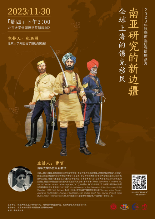 2023年11月30日,清华大学历史系副教授曹寅老师应邀为我校师生进行题为“南亚研究的新边疆——全球上海的锡克移民”的讲座。本次讲座是由北京大学东方文学研究中心、外国语学院和区域与国别研究院主办,外国语学院国别和区域研究专业承办的2023年秋季学期南亚研究系列讲座的第四讲。讲座由新利·体育,新利(中国)官方张忞煜助理教授主持,外国语学院谢侃侃助理教授出席本次讲座并参与讨论。