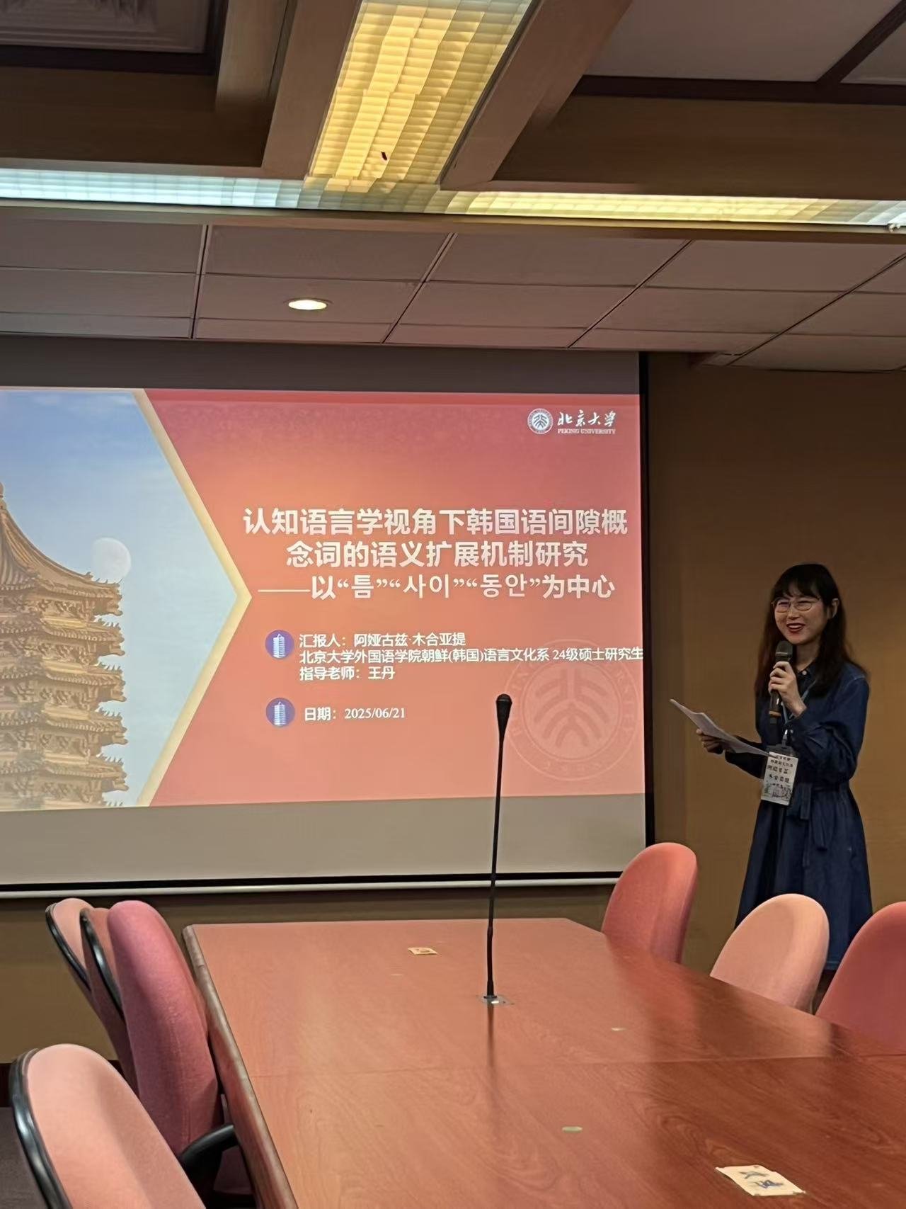 开幕式后,论坛进入发言讨论环节,来自五校的11名研究生宣读论文,参会同学就论文内容进行了热烈讨论与深入交流,参会老师们给予点评与指导。第一场主题发表由山东大学牛林杰老师担任主持,山东大学孙正盛同学、南京大学张明娟同学、山东大学王丽媛同学、北京大学王恩泽同学先后以《镜与梦的想象力——「鸟瞰图·诗第十五号」的情感节制与痛苦流露》、《柳基石中文笔名小考》、《救亡·建构·消解:抗日语境下东亚戏剧的安重根叙事》、《塑造“华界”:中国近代在朝华商租界制度的构想与实践》为题发言。第二场主题发表由北京大学王丹老师担任主持,北京大学阿娅古兹·木合亚提同学、台湾政治大学顾奕伃同学、台湾中国文化大学马郁媙同学先后以《认知语言学视角下韩国语间隙概念词的语义拓展机制研究——以“틈”,“사이”,“동안”为中心》、《韩中原因理由表现对照研究——以韩语原因理由表现-어서,-니까,-기 때문에为例》、《针对华语学习者的韩语汉字否定前缀词教学研究——以「무-(無)」、「불/부-(不)」为中心》为题发言。第三场主题发表由南京大学郑墡谟老师担任主持,南京大学朱庆林同学、台湾政治大学普唯祯同学分别以《高丽末儒臣李穑的中国体验与天下观》、《朝鲜汉诗时调译与时调汉译诗的翻译策略考察》为题发言。第四场主题发表由台湾中国文化大学郑润道老师担任主持,台湾中国文化大学陈禹臻同学、台湾政治大学周筱蓓同学分别以《台韩职场霸凌防治制度比较研究》、《性别言谈中韩文问句功能的差异探讨:以韩国综艺节目<单身即地狱>第一季为中心》为题发言。