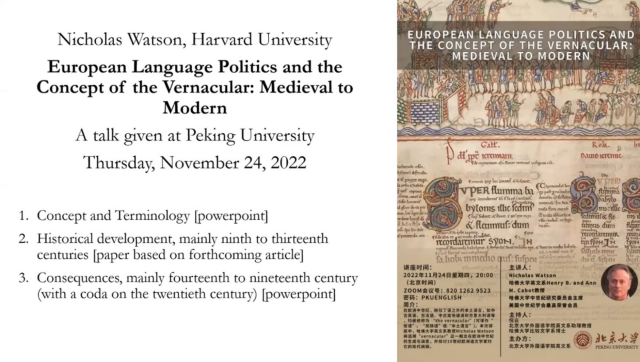 哈佛大学英文系Nicholas Watson教授讲座预告:欧洲中世纪到现代的语言政治与俗语的概念