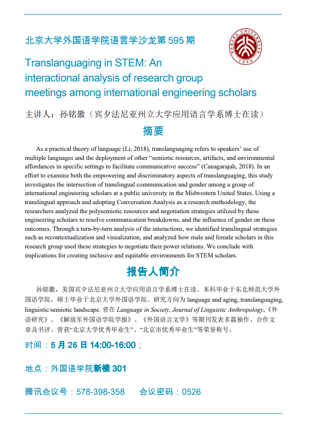 服务导航 新利·体育,新利(中国)官方语言学沙龙第595期:Translanguaging in STEM:An interactional analysis if research group meetings among international engineering scholars 2023-05-21