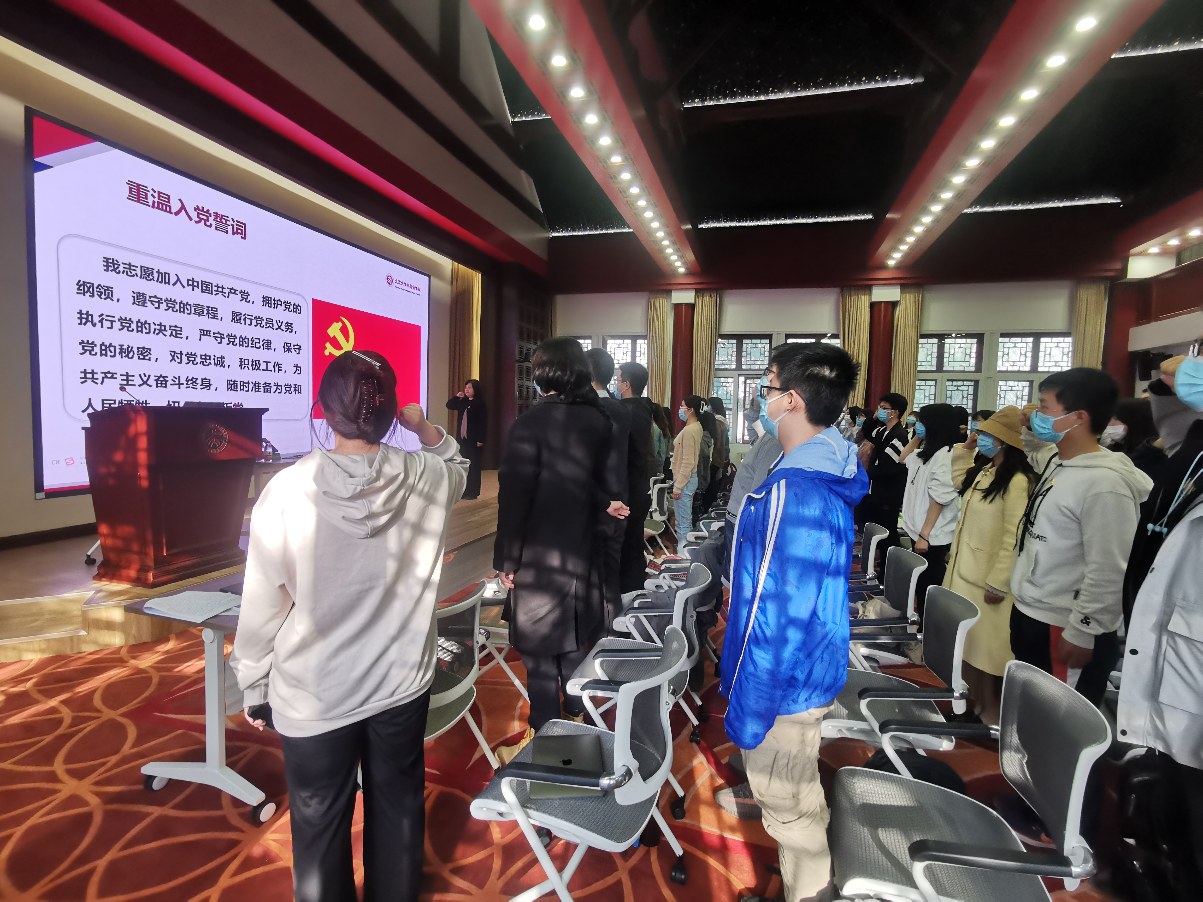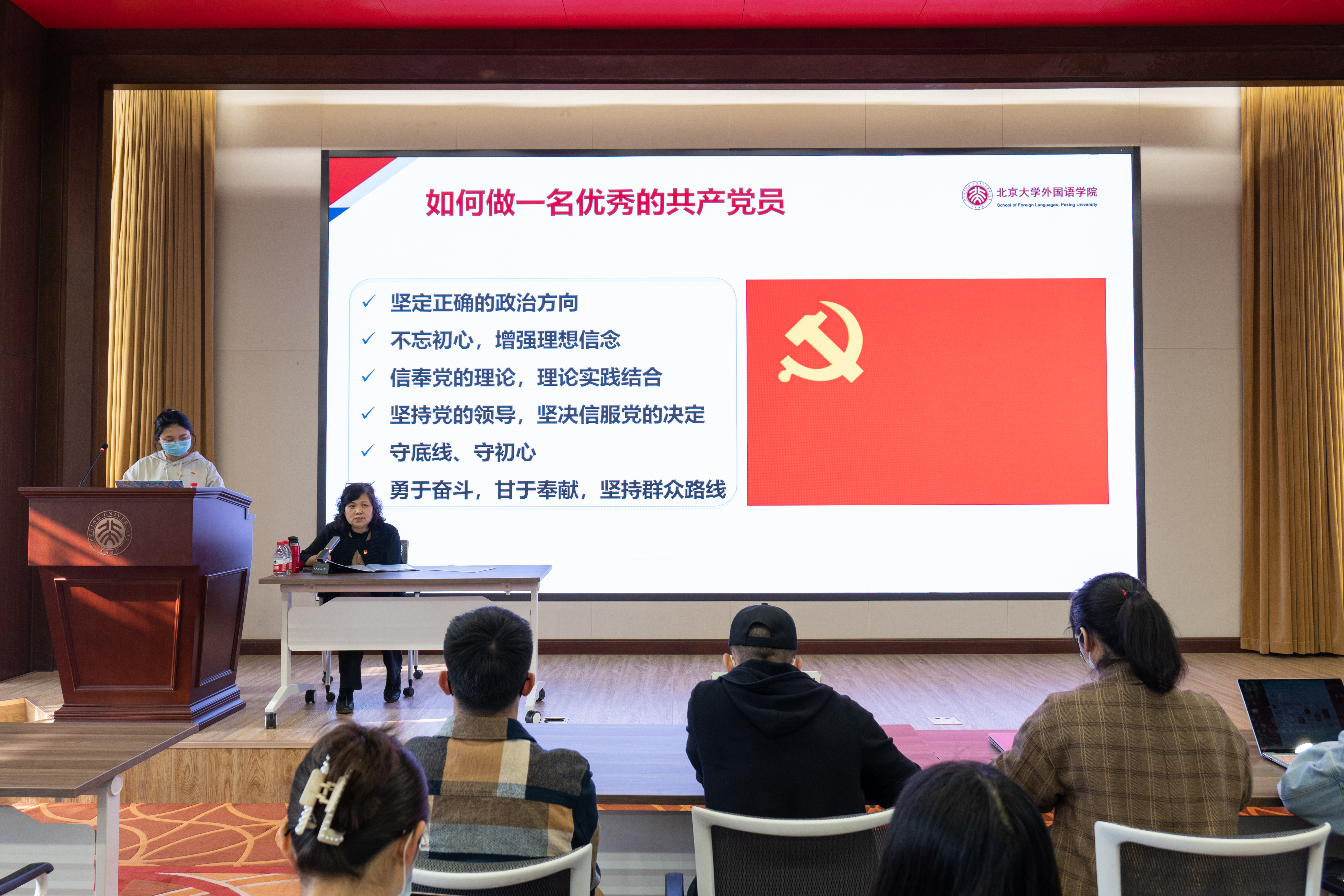 北京大学是中国马克思主义的发祥地,是中国共产党早期活动基地,是最早进行马克思主义理论教育的大学。北大始终与国家和民族的命运紧密相连,前有李大钊、王复生、范鸿劼等人为党和国家的发展作出重要贡献,今有樊锦诗、屠呦呦、钟南山等人鞠躬尽瘁,献身科研。在接下来的党课中,李老师通过讲述同学们身边的党员榜样故事来诠释优秀共产党员应有的特质。见证了祖国崛起、民族复兴的外国语学院英语专业教授胡壮麟老师,三登鸟巢舞台的翩翩舞者、体育教研部秦朗老师,园子里的“雪燕”、用文字书写冬奥志愿服务的外院多语种冬奥稿件翻译团队……他们都以坚定的理想信念坚守初心和使命,展现出了知行合一的优秀共产党员形象,鲜活的事例无不激励着同学们践行新时代青年的责任与担当,在组织、思想和行动上同步入党。
