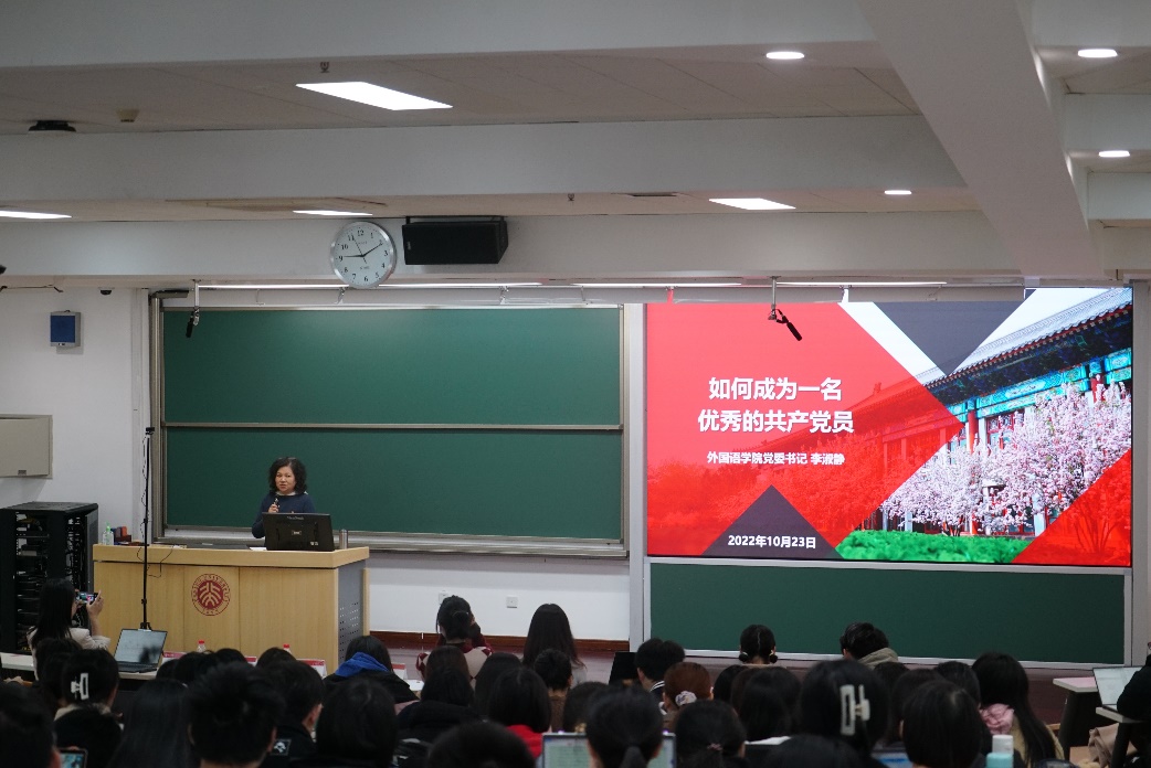 10月23日上午,北京大学第35期党的知识培训班外国语学院开班仪式暨党委书记讲党课活动在北京大学理科教学楼107教室举行。本次党课由学院党委书记李淑静担任主讲。学院团委书记伍昕钰、党委秘书冯一帆、团委副书记熊珊儿出席会议。参加本期党的知识培训班的200余名外院学子满怀憧憬齐聚一堂,认真聆听,接受教育。活动由学院团委常务副书记、第35期党的知识培训班领队辅导员丁雨婷主持。
