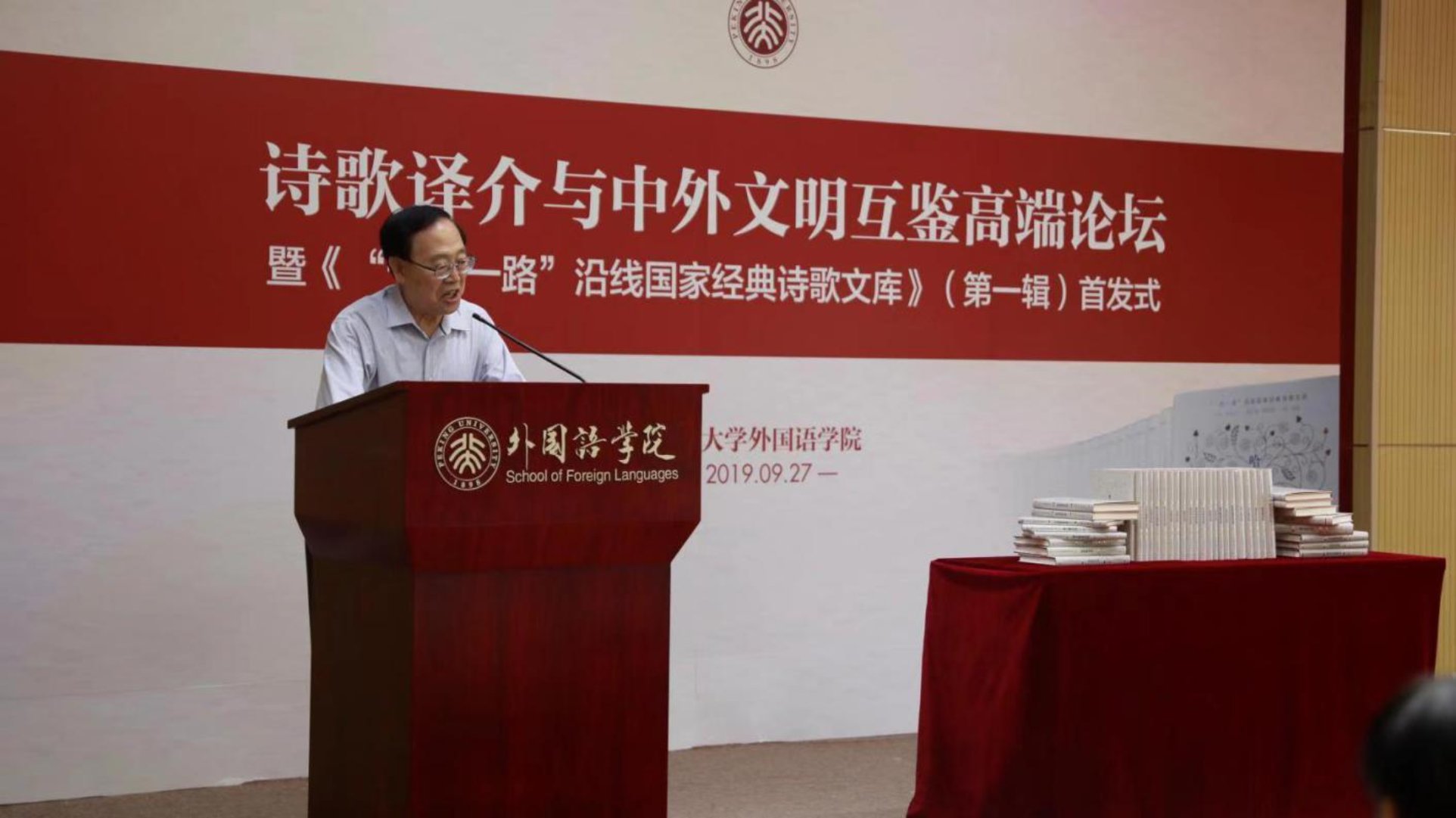 2019年9月27日上午,《“一带一路”沿线国家经典诗歌文库》(第一辑)发布会暨诗歌译介与中外文明互鉴高端论坛在新利·体育,新利(中国)官方新楼举行。“一带一路”沿线部分国家驻华使馆代表、北京大学党委书记邱水平出席活动并致辞。来自北京大学、清华大学、北京外国语大学、首都师范大学、中国传媒大学、社科院、作家出版社、中国诗歌学会等高校与研究机构的专家学者出席活动。仪式由新利·体育,新利(中国)官方院长宁琦主持。