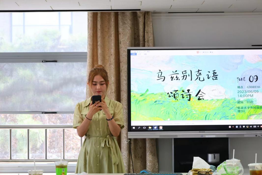 2023年6月9日,“一带一路”外国语言与文化系列公共课程项目下的“公共乌兹别克语(二)”任课教师在新楼201会议室组织了“乌兹别克语颂诗会”。作为课程的一部分,该活动旨在提高学生的语言水平,熏陶文学素养。参加北京大学公共乌兹别克语(二)的12名师生以及中央民族大学外国语学院俄语—中亚语专业的7名师生参加了此次颂诗会。任课教师古丽巴努木·克拜吐里、中央民族大学外国语学院副教授吉莉(Dilsora Mirzaakhmedova)和外国语学院助理教授施越出席了此次活动。