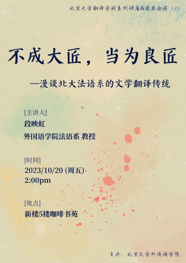 2023年10月20日下午,第三期北京大学翻译学科系列讲座暨圆桌会谈在外国语学院新楼咖啡苑举行。本次会谈由段映虹教授主讲,题为“不成大匠,当为良匠——漫谈北大法语系的文学翻译传统”。法语系秦海鹰、陈燕萍、罗湉、王斯秧、章文老师,南亚系范晶晶老师、日语系岳远坤老师,西葡意语系范晔、闵雪飞老师,英语系梅申友老师及中文系比较所高冀老师参加了本次讲座。