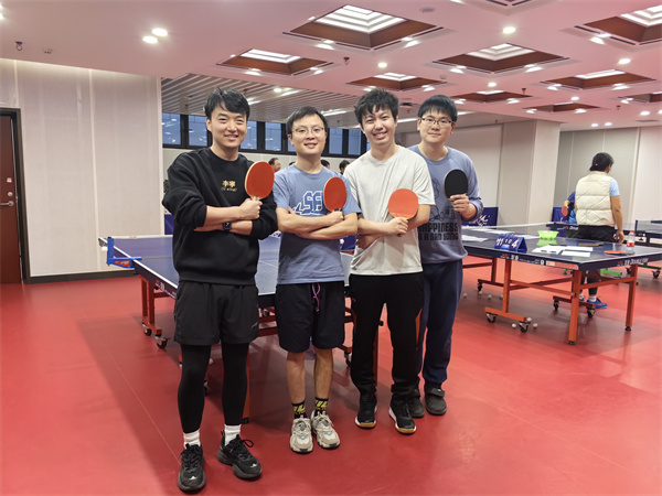 外国语学院男子队由伍昕钰、尹旭、陈瑞翾、王乃懋组成,12月9日,他们遭遇了实力强劲的计算机信科联队、集成电路学院2队、图书馆2队。伍昕钰老师球风凌厉,遇强则强,屡次出任第一单打,与对手比分焦灼,然而在关键球的处理上稍显稚嫩,遗憾落败。尹旭老师则依靠削球多次打出变幻莫测的回球,赢得对手的连连点赞,在当日比赛中为队伍赢下了一分。陈瑞翾老师球风沉稳,直拍打法反应灵敏,节奏极快。王乃懋老师在乒乓球打法上比较单一,主要依靠上旋球,难以破解对手多变的回球,无奈落败。