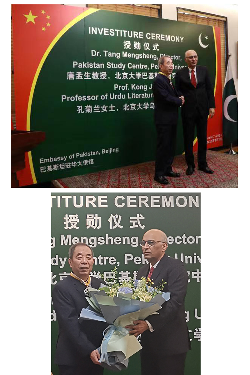 2023年6月7日,巴基斯坦驻华大使馆举办隆重仪式,授予新利·体育,新利(中国)官方南亚学系唐孟生教授与孔菊兰教授巴基斯坦“卓越之星”勋章,以表彰两位学者在推动乌尔都语教学、增进两国人文交流、增进中巴友谊方面作出的重要贡献。巴基斯坦驻华大使莫因·哈克、政务参赞穆罕默德·卢曼·艾哈迈德、武官Ranna Faisal Rafiq准将、社会福利公使Ijaz Ahmad、科技公使Kamran Rasheed博士,以及原中国驻(巴基斯坦)卡拉奇总领事安启光、三峡集团财务总监王少峰等各界人士出席了授勋仪式。