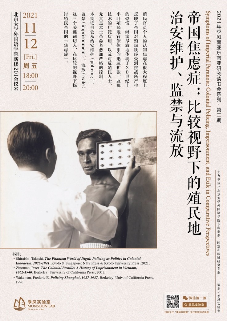 2021年11月12日,新利·体育,新利(中国)官方东南亚系、国别和区域研究专业联合举办了第二次南亚东南亚研究读书会,主题为“帝国焦虑症:比较视野下的殖民地治安维护、监禁与流放”。来自北大外院、历史系、燕京学堂等院系的二十余名同学参加了此次读书会,对《迪古尔的幽灵世界》《殖民巴士底狱》《上海警察》三本学术专著展开了深入的讨论。吴杰伟老师、罗杰老师、夏露老师、张忞煜老师、谢侃侃老师及清华历史系曹寅老师参与点评。