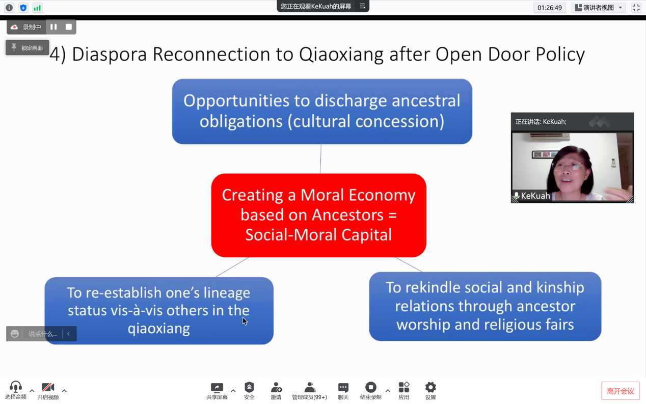 柯群英老师的讲座围绕其专著《重建祖乡:新加坡人在中国》展开。她指出,20世纪80—90年代,许多新加坡华人重返祖乡,并努力为当地的社会、经济发展做贡献。在这一过程中,祖先崇拜成为一种社会道德资本,将华人与侨乡联系起来。柯老师以中国福建省安溪县蓬莱地区的村民和新加坡华人群体作为研究对象,讨论离散华人群体、侨乡村民和中国侨乡三者之间的关系。1978年改革开放后,中国实施有利于经济发展的政策,吸引海外华人投资,让侨乡发展变成新的经济增长点。