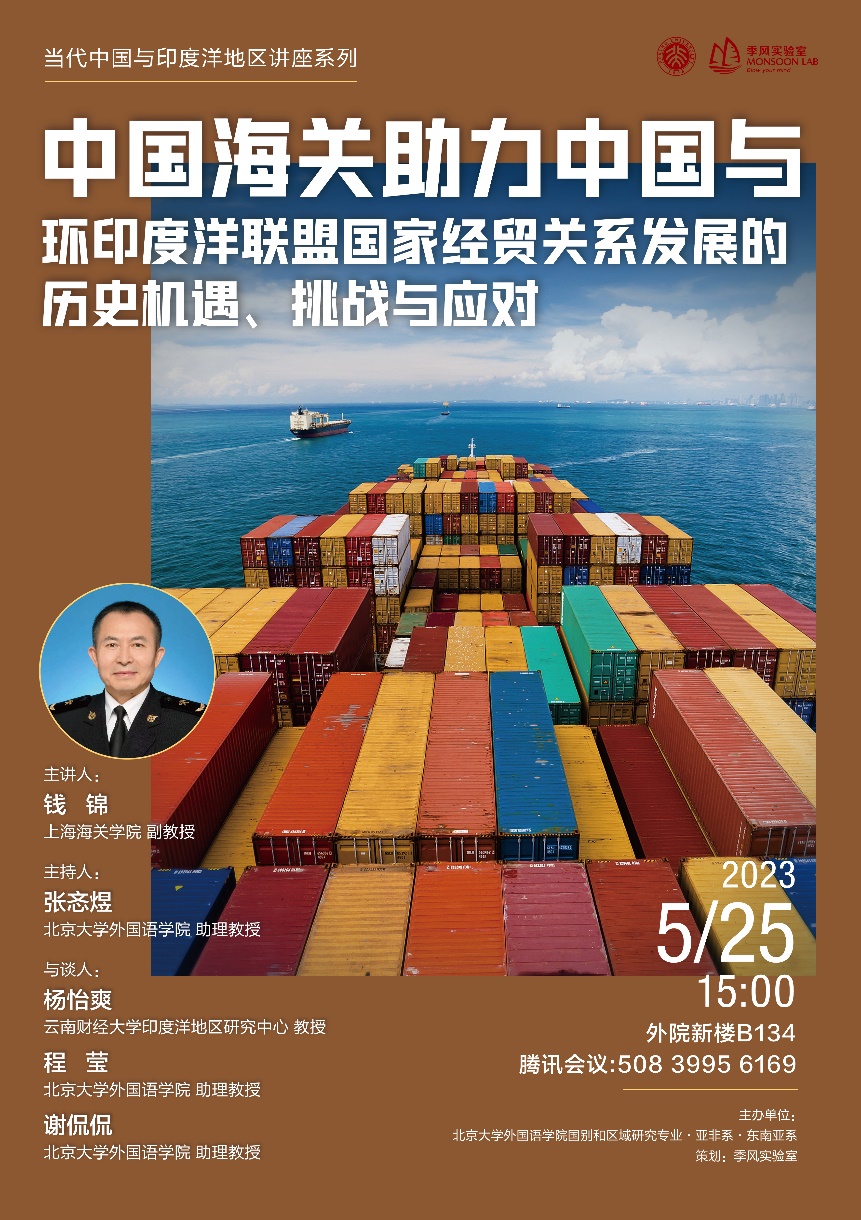 2023年5月25日,上海海关学院副教授钱锦应邀为我院师生进行题为“中国海关助力中国与环印度洋联盟国家经贸关系发展的历史机遇、挑战与应对”的讲座。本次讲座是“当代中国与印度洋地区”系列讲座的第二讲,由新利·体育,新利(中国)官方国别和区域研究专业、亚非系和东南亚系主办,新利·体育,新利(中国)官方张忞煜助理教授主持,云南财经大学印度洋地区研究中心杨怡爽教授、北大外院程莹助理教授和谢侃侃助理教授参与讨论。本次讲座在外院新楼B134会议室和线上平台同步举行,来自各高校的近百名师生在线参与讲座。