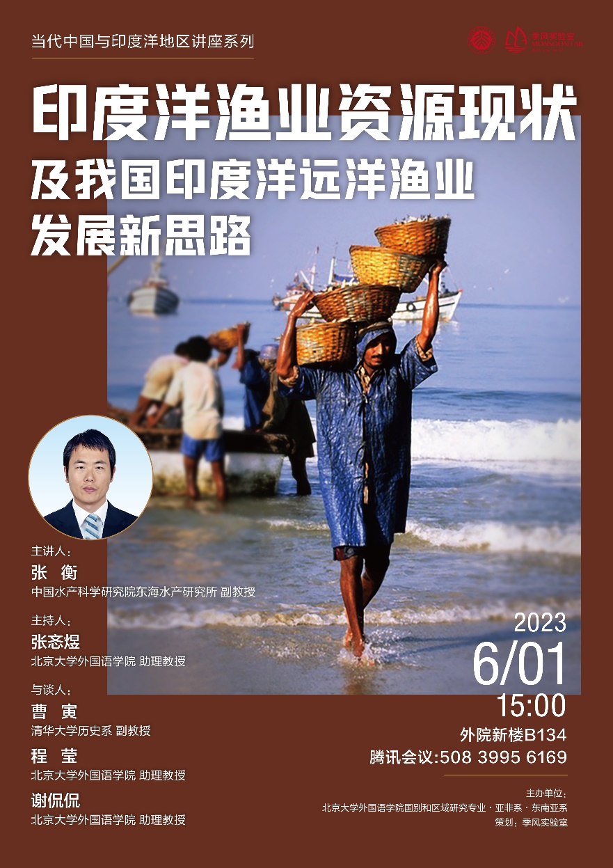 2023年6月8日,中国水产科学研究院东海水产研究所副研究员张衡老师应邀为我院师生进行题为“印度洋渔业资源现状及我国印度洋远洋渔业发展新思路”的讲座。本次讲座属于“当代中国与印度洋地区”系列讲座,由新利·体育,新利(中国)官方国别和区域研究专业、亚非系和东南亚系主办,新利·体育,新利(中国)官方张忞煜助理教授主持,清华大学历史系曹寅副教授和北大外院谢侃侃助理教授参与讨论。本次讲座在外院新楼B134会议室和线上平台同步举行,吸引了相关部门和国内外高校的百余名师生在线参与讲座。