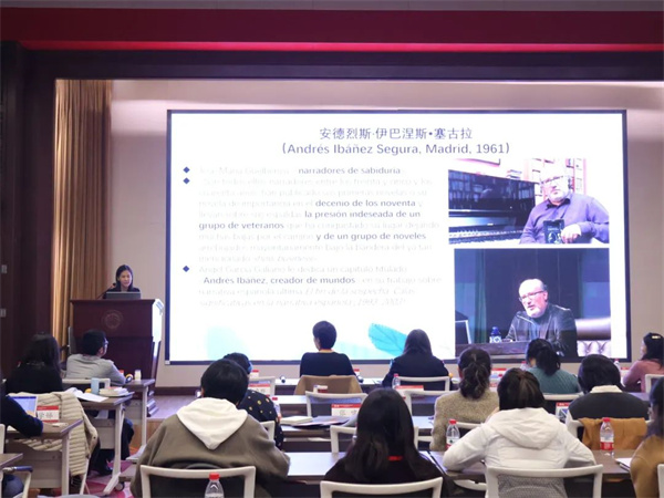分论坛一的主题是“西葡语文学与作家作品研究(一):谱系·时代·伦理”,分论坛由南京大学张伟劼主持,与会学者的论文涉猎十九世纪至当代十余位西葡语作家的写作实践与文艺思考。首都师范大学杨玲以安德烈斯·伊巴涅斯《一种更高的生活》为例,从文体、主题、修辞等方面剖析这位西班牙当代作家的艺术风格,评析这部作品如何“把小说写成音乐”,探索并到达真正的彼岸。中国人民大学李卓群提炼并阐释了西班牙战后作家马丁-桑托斯以“辩证现实主义”与“低层现实主义”为核心的文艺创作观,在文本细读中展示作家对其文艺观的创作实践。北京大学蔡学娣分析西班牙当代作家安德烈斯·巴尔瓦《光明共和国》中的儿童形象,探讨作者对于传统的“童真”概念的质疑和重新定义,以及对于秩序、暴力以及文明本身等理念的反思和重构。南开大学梁嘉艺关注西班牙当代作家阿尔瓦罗·庞波,指出其小说通过对存在主义的思考,揭示了伦理与道德的重要性:只有在一定的伦理关系中遵循道德的牵引,才能在纷杂的世界中完成自我价值的实现。东南大学田原聚焦当代哥伦比亚作家劳拉·雷斯特雷波文学创作中的情感书写与社会批判,阐释她作品中丰富的情感主题及其叙述方式,挖掘作品如何反映社会问题,揭露社会不公和人性弱点。汕头大学史志龙关注阿根廷作家安娜·玛丽亚·舒亚的微小说创作,探讨她如何在有限的篇幅内实现叙事的深度和广度,揭示其作品中的拉美文化、社会意义和政治现状。北京大学许彤的研究基于西班牙十九世纪文人贝克尔的诗歌创作和诗歌批评,通过文本细读,探讨“‘干’‘炼’之诗”风格创新中蕴含的抒情内在化和抽象化诉求,分析贝克尔抒情诗的现代性表征。北京理工大学曾艳分析艾米莉亚·帕尔多·巴桑叙事文本中作为表征的时尚案例,解读十九、二十世纪之交西班牙“新女性”形象及其背后的历史传统和当代社会思潮。浙江越秀外国语学院张啸研究豪尔赫·纪廉诗歌中“物本体书写”话语谱系,通过对物本体的多样谱写,诗人反思批判了人类中心主义,构建物的诗性自治,实现了“走出人类世”的“物物共生”诗歌生态化的可能。中国传媒大学黄婷以巴西诗人哈罗德·德·坎波斯翻译理论中的“创译”批评思想为根据,探究巴西具体派诗人对中国古典诗歌的美学解读和“再想象”、“再创造”过程中所提出的翻译问题。马德里自治大学盛妍分析何塞·安赫尔·巴伦特的三首艺格敷词诗歌,以及路易斯·费尔南德斯和保罗·克利的三幅画作,通过比较研究强调自然作为艺术灵感之源与哲学探究之源的持久相关性。评议人卢云、谷佳维、张伟劼、杨玲、许彤与十一位参与论文发表的老师展开了交流。