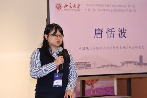 中国现代国际关系研究院中东研究所副研究员唐恬波的报告“中国在伊拉克库尔德地区的利益及政策”分析了中国在伊拉克库区的主要利益与政策。她从政治利益、经济利益和人员利益三个方面展开了详细分析,并对中国与库区的交往的特点做了“三个不变与两点变化”的总结和思考,这决定了双边关系发展的前景与限度。