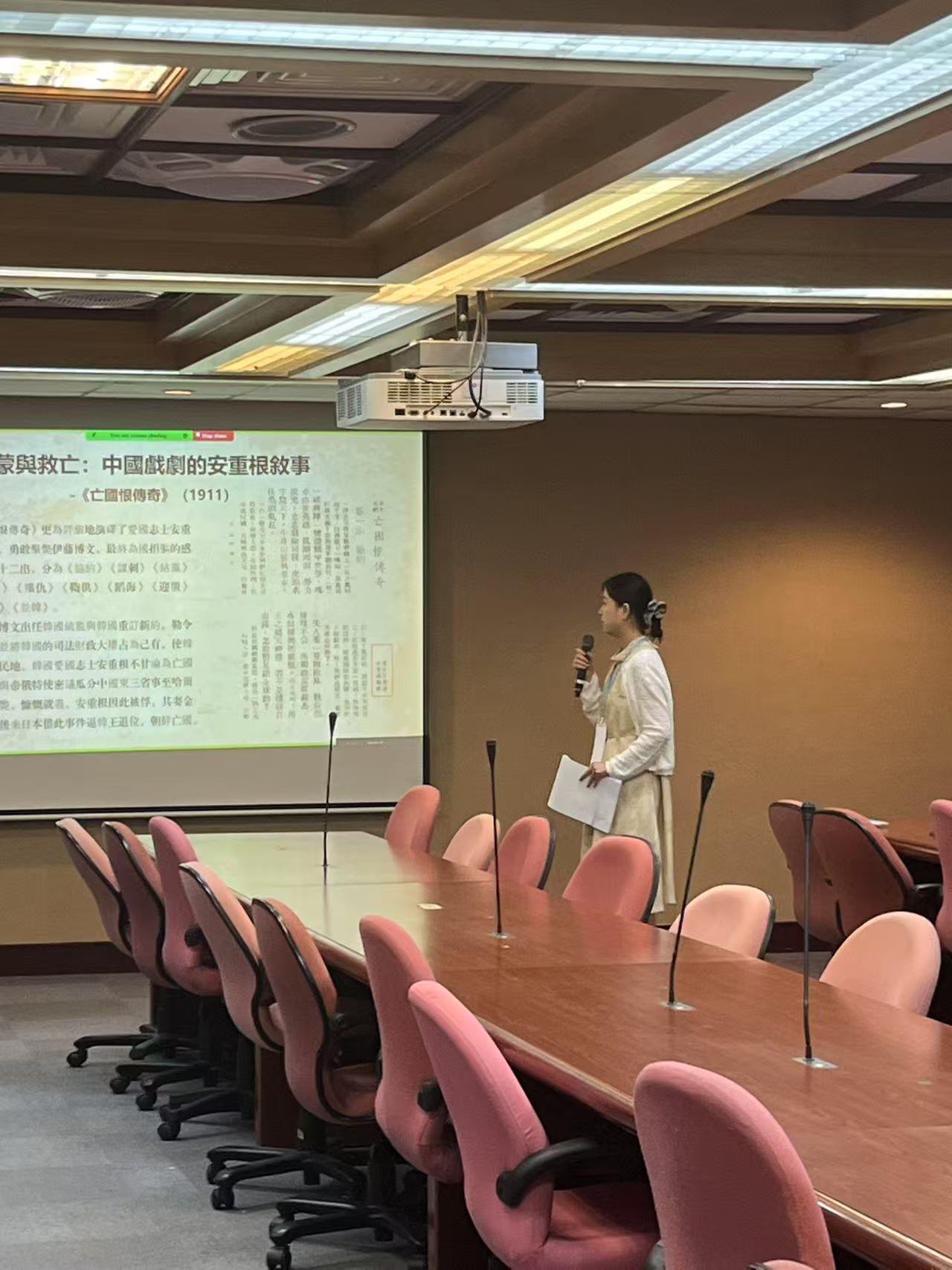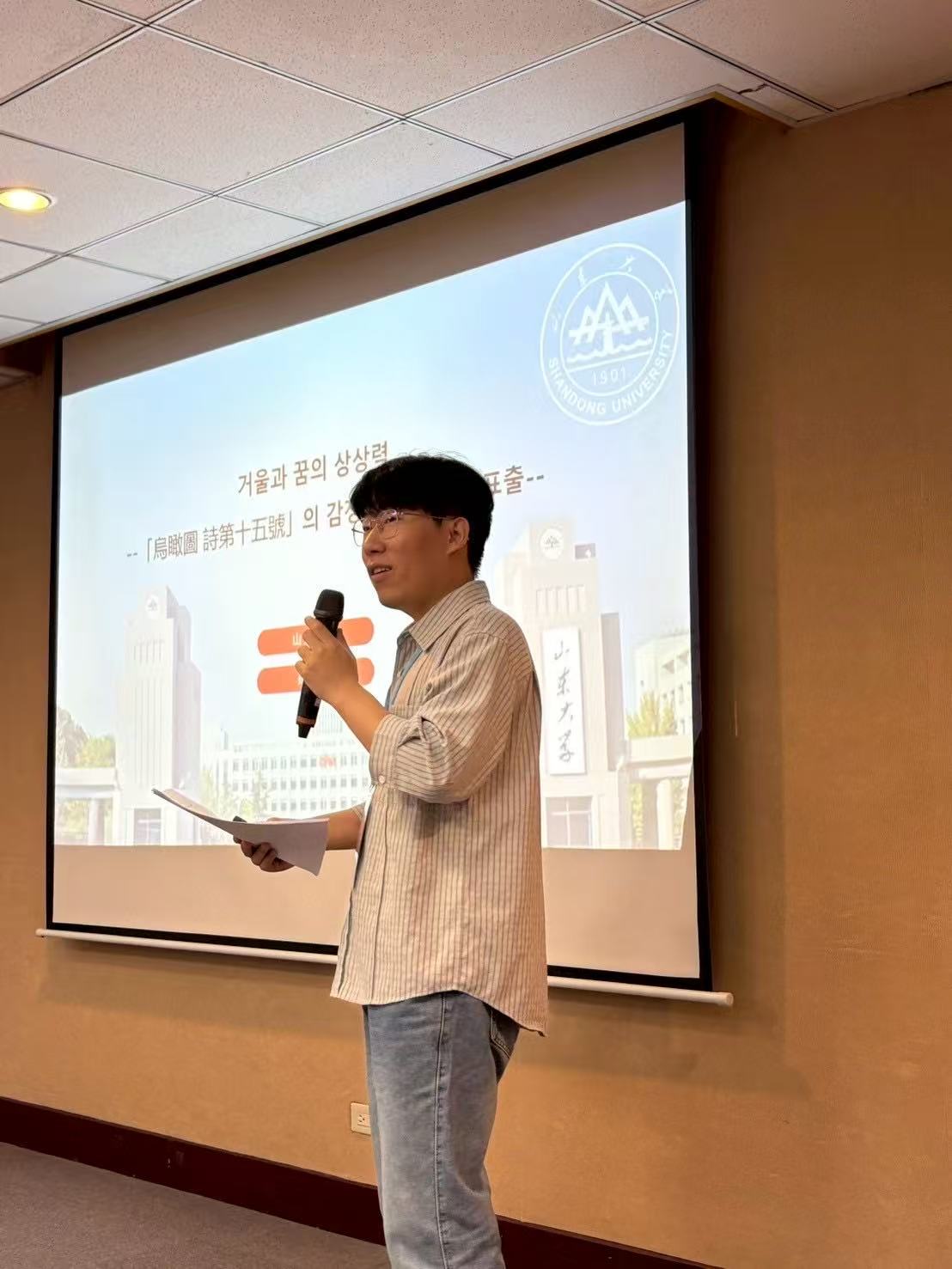 开幕式后,论坛进入发言讨论环节,来自五校的11名研究生宣读论文,参会同学就论文内容进行了热烈讨论与深入交流,参会老师们给予点评与指导。第一场主题发表由山东大学牛林杰老师担任主持,山东大学孙正盛同学、南京大学张明娟同学、山东大学王丽媛同学、北京大学王恩泽同学先后以《镜与梦的想象力——「鸟瞰图·诗第十五号」的情感节制与痛苦流露》、《柳基石中文笔名小考》、《救亡·建构·消解:抗日语境下东亚戏剧的安重根叙事》、《塑造“华界”:中国近代在朝华商租界制度的构想与实践》为题发言。第二场主题发表由北京大学王丹老师担任主持,北京大学阿娅古兹·木合亚提同学、台湾政治大学顾奕伃同学、台湾中国文化大学马郁同学先后以《认知语言学视角下韩国语间隙概念词的语义拓展机制研究——以“틈”,“사이”,“동안”为中心》、《韩中原因理由表现对照研究——以韩语原因理由表现-어서,-니까,-기 때문에为例》、《针对华语学习者的韩语汉字否定前缀词教学研究——以「무-(無)」、「불/부-(不)」为中心》为题发言。第三场主题发表由南京大学郑墡谟老师担任主持,南京大学朱庆林同学、台湾政治大学普唯祯同学分别以《高丽末儒臣李穑的中国体验与天下观》、《朝鲜汉诗时调译与时调汉译诗的翻译策略考察》为题发言。第四场主题发表由台湾中国文化大学郑润道老师担任主持,台湾中国文化大学陈禹臻同学、台湾政治大学周筱蓓同学分别以《台韩职场霸凌防治制度比较研究》、《性别言谈中韩文问句功能的差异探讨:以韩国综艺节目<单身即地狱>第一季为中心》为题发言。