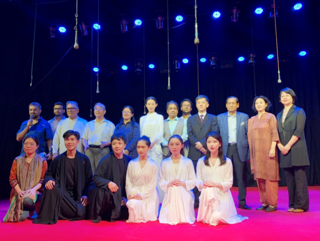 以选修过北京大学大类平台课“东方文学”、通选课“泰戈尔导读”课程同学为主体的泰戈尔戏剧爱好者为与会学者呈现了泰戈尔经典剧目“齐德拉”,他们的精彩表演获得了观众的热烈欢迎。“齐德拉”在达卡大学和孟加拉国国家艺术院的两场开幕公益演出深受各界嘉宾赞赏,孟加拉国十余家媒体做了采访和报道。中国驻孟加拉国大使馆临时代办刘振华先生、文化参赞孙延女士、孟加拉国文化部国务部长卡利德先生、孟加拉国达卡大学校长阿卡特瑞扎曼教授、孟中友谊中心主任侯赛因先生等观看了演出并与演员亲切合影留念。来自孟加拉国文化部、教育部、媒体、友协、达卡大学、华人华侨、孔子学院(课堂)等各界人士千余人现场观看了演出。活动期间来自达卡大学、孟加拉国国家艺术院的艺术家们和“齐德拉”团队同台表演了泰戈尔歌舞和经典剧目“神车之行”。(文图:魏崴 )