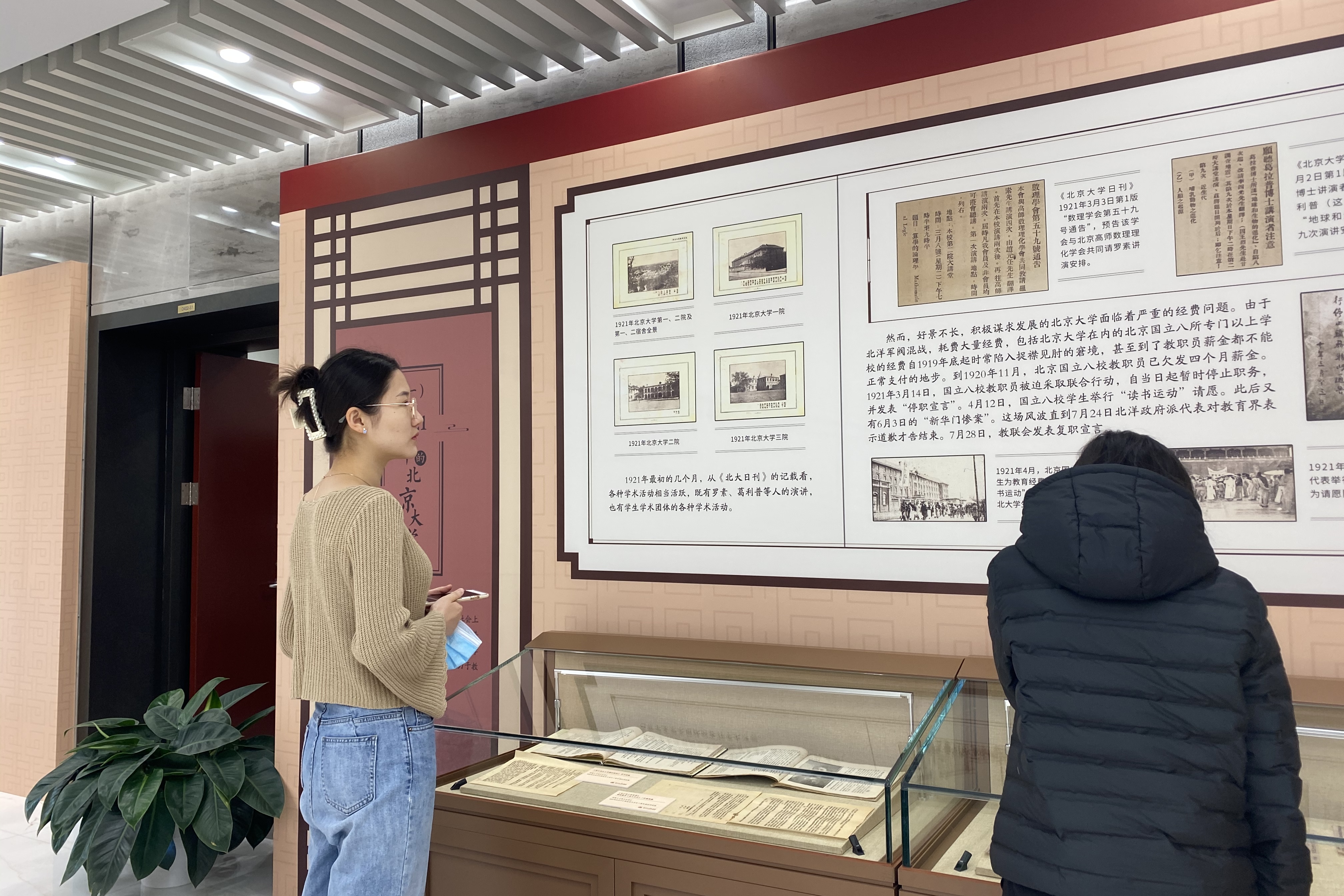 同学们走进展览认真观看,感受百年前北大浓厚的学术氛围和先进的办学理念。该展览共分为六个版块,分别从著名学者、学术交流、学术演讲、学术出版等主题展现1921年北大学术发展的方方面面,如罗素及勃拉克夫人来北大演讲,虽风雨交加仍座无虚席;还介绍了丰富多彩的学生社团,如马克思学说研究会、新潮学社等。展览中多样的内容不仅展现了百年前青年学子有声有色的社团活动,更展现了百年前北大学子勤学求知的向学精神、勤思求新的研究精神。