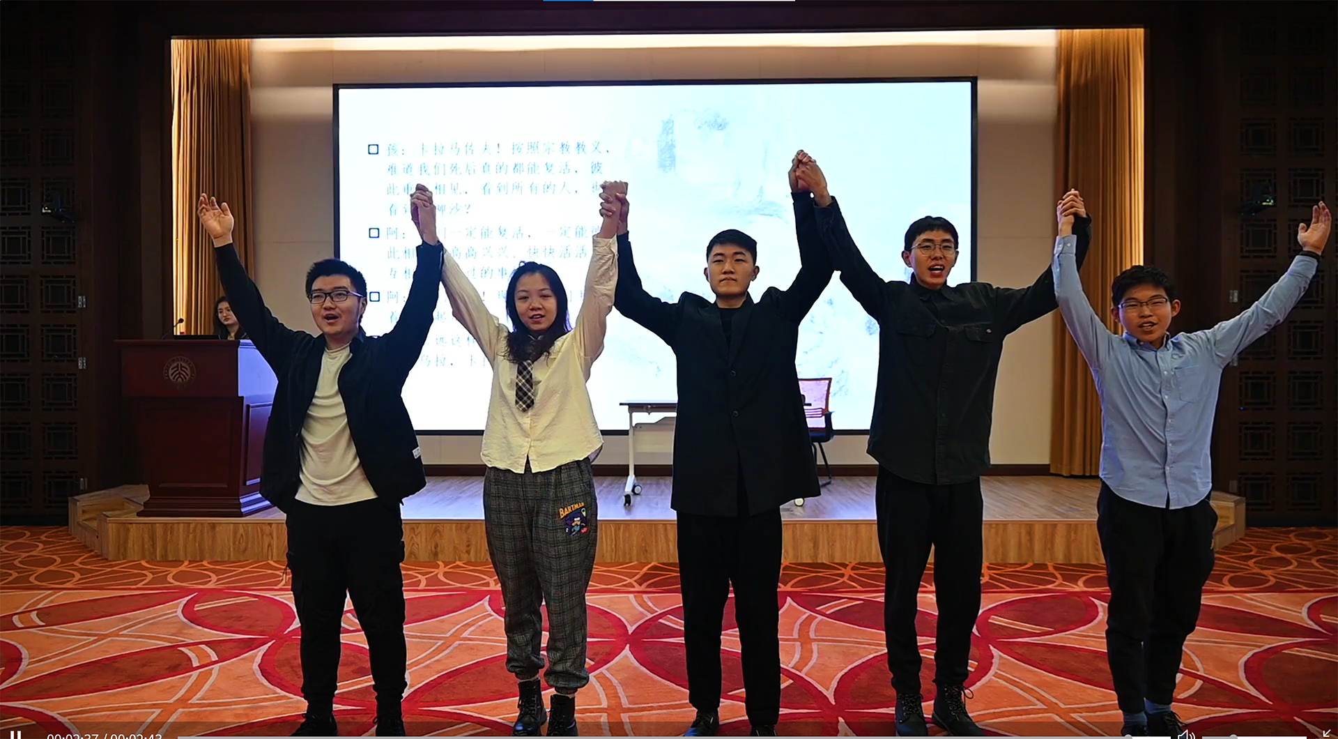 由新利·体育,新利(中国)官方俄罗斯语言文学系同学排演的三幕话剧«Раскольник и др.»(《拉斯柯尔尼科夫一众》)是本次活动的第五个节目。整部剧时长约十六分钟,《地下室手记》《罪与罚》《群魔》《荒唐人的梦》《卡拉马佐夫兄弟》中的主人公们轮番登场,他们在惶恐焦虑、急切不安的状态下爆发,以难以遏制的激情直抒胸臆。通过他们的表演,观众可以理解陀氏人物的内心世界,体会他们在思想上的传承、在观念上的碰撞。每幕仅五六分钟的话剧,布景道具要而不繁,汇聚传统手法和现代风尚,有力呈现了陀氏作品的精神内涵。
