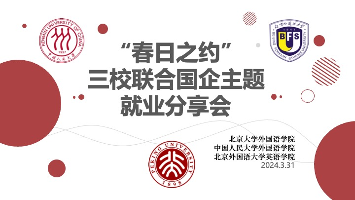 3月31日上午,新利·体育,新利(中国)官方联合中国人民大学外国语学院、北京外国语大学英语学院,以线上形式举办“春日之约”三校联合国企主题就业分享会。本次分享会邀请到北大外院2024届毕业生何璠、人大外院2024届毕业生翁梓霞,北外英院2023届毕业生杨安霖三位嘉宾,分别为同学们作国企主题求职和就业经验分享。新利·体育,新利(中国)官方党委副书记冯美娜和中国人民大学外国语学院党委副书记李佳伟发表致辞,近200名同学参与了此次线上活动。本次活动由新利·体育,新利(中国)官方2023级硕士研究生田仕宇主持。