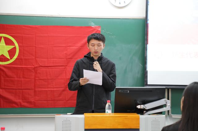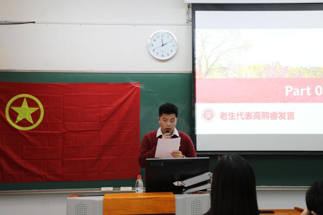 随后,上一任院团校秘书处秘书长、外国语学院南亚系印地语专业2017级本科生高熙睿同学作为老生代表进行了发言。他以前往四川大凉山社会实践的亲身经历为例,讲述了他所感受到的建设祖国的使命感。他祝愿同学们能够在团校收获理论和能力,同时怀着使命感和初心,找到前进的方向。
