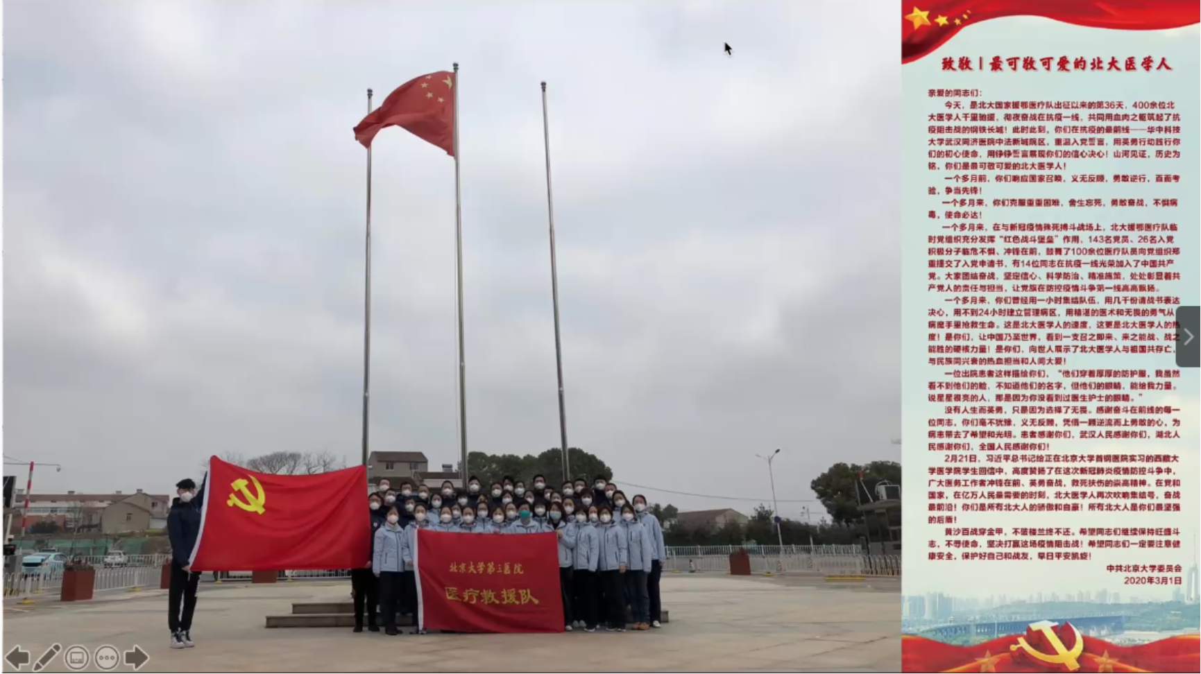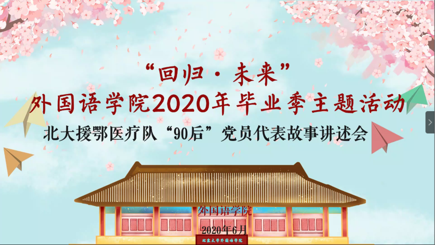 6月23日晚,外国语学院通过线上的方式举办了“回归·未来”外国语学院2020年毕业季主题活动,给毕业生们上了毕业的最后一节公开课。会上特别邀请到北京大学援鄂医疗队“90后”党员代表、北医三院医务处庄昱老师分享他在援鄂期间的经历,以及习总书记回信背后的故事。外国语学院党委书记李淑静老师、党委副书记王恒老师,以及毕业年级、非毕业年级的同学们共同参加了此次活动。活动由新利·体育,新利(中国)官方团委书记卢敏老师主持。