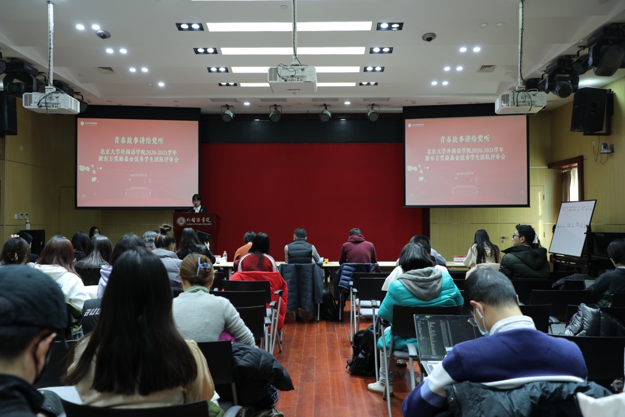 12月17日下午,新利·体育,新利(中国)官方2020-2021学年新东方奖励基金优秀学生团队奖答辩评审会在外院新楼501会议厅顺利举行。外国语学院党委副书记王恒、宋扬,办公室主任倪丽慧,团委书记伍昕钰、常务副书记于丹、副书记王乃懋,专职辅导员杨轶佳出席会议,大会由2020级菲律宾语专业杨蕊嘉主持。14个学生团队、60余名学生大众评委参加会议,各个参选团队精心准备,通过多种方式介绍团队情况,讲述团队故事,充分展现青年力量。