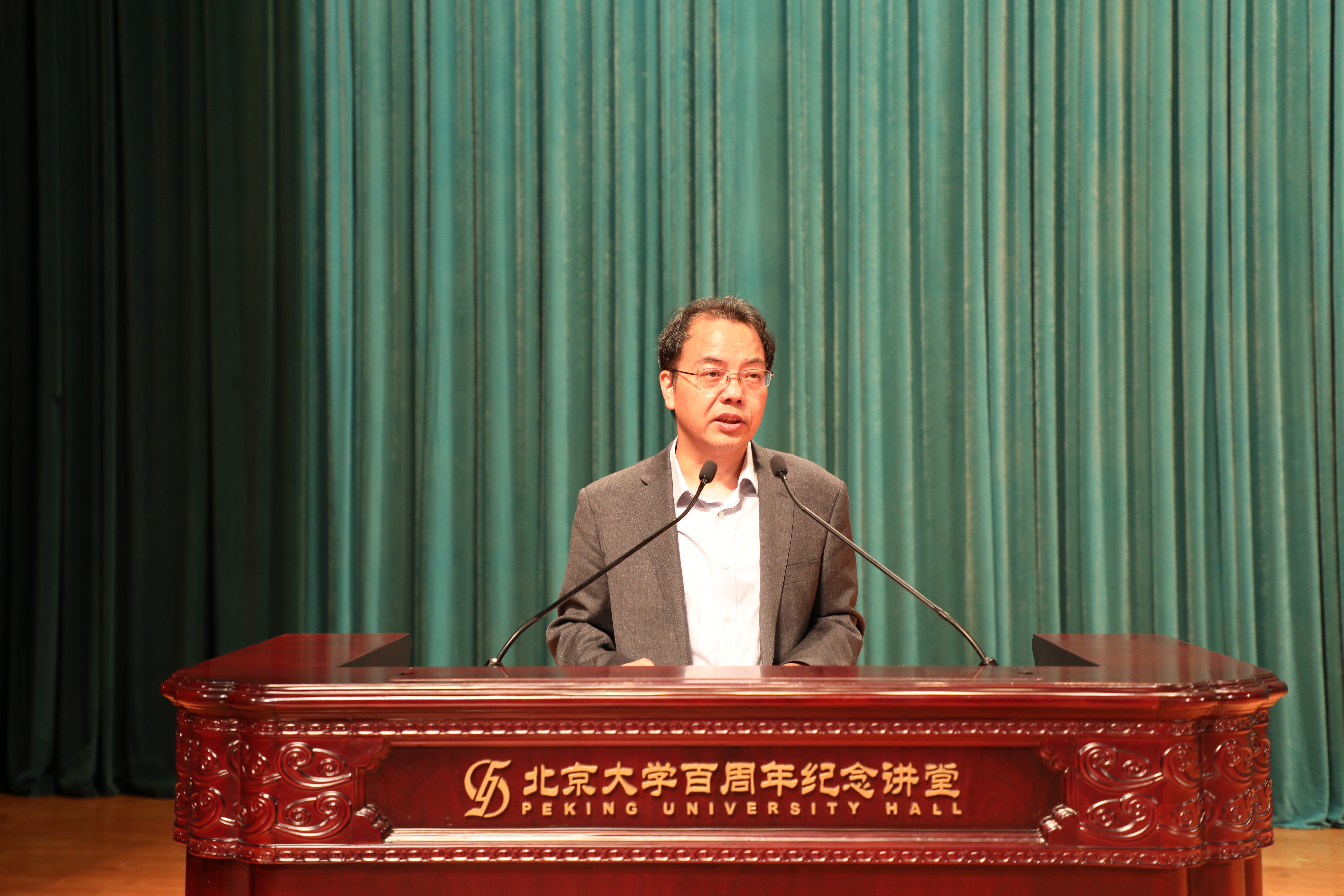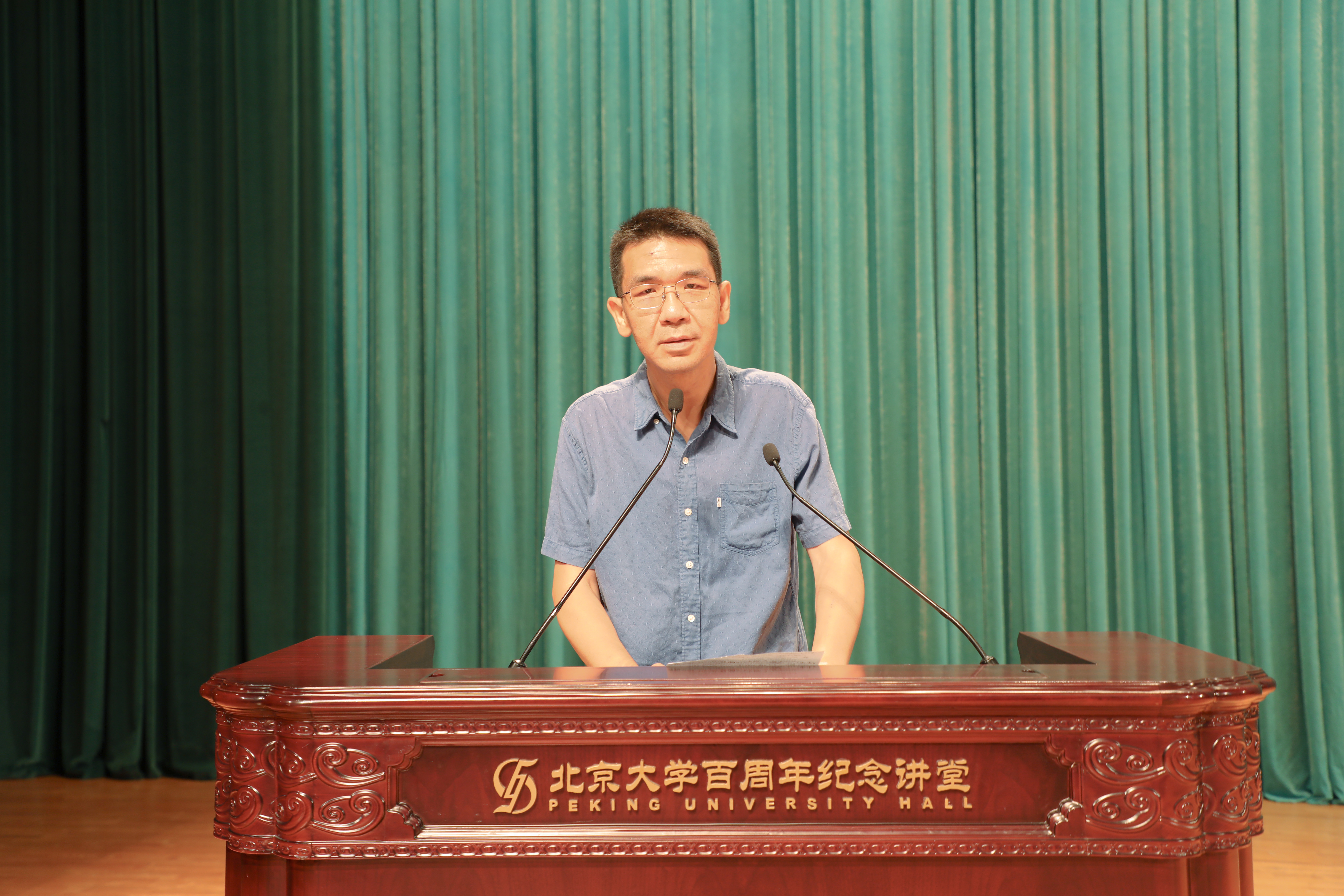 在热烈的掌声中,院长陈明教授为新生送上开学寄语。他回顾了本科新生的军训历程,以及研究生同学们的报到风采,代表外国语学院向各位新同学表示最热烈的欢迎和最诚挚的祝贺。对初入燕园的新生们,陈老师期待大家孜孜不倦,精进学问,潜心学习,厚积薄发。同时,他叮嘱同学们学习接纳和适应多元的评价标准,成长为兼具扎实语言功底与批判性思维、创新能力的英才,能够勇担时代重任。心怀家国,躬行实践,是外院人“世界在我脚下,祖国在我心中”的具象表达,陈老师鼓励同学们传承外院人的优良传统,为中外交流互鉴贡献力量。最后,他祝愿新生同学在北大外院积蓄力量、收获成长,羽翼渐丰化鸿鹄,腾翔苍穹展宏图,从外院出发,走向更广阔的人生。