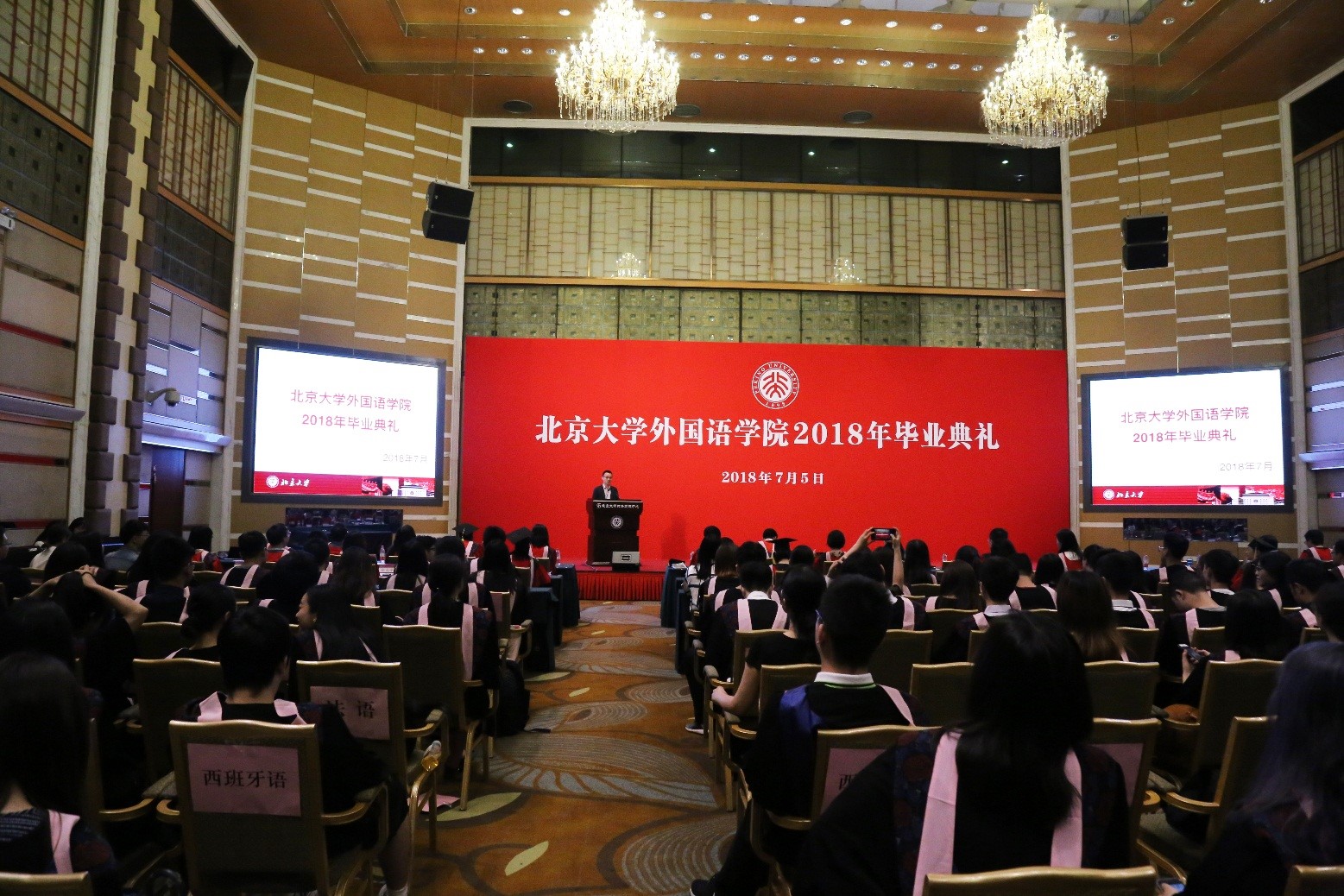 2018年7月5日上午,新利·体育,新利(中国)官方2018年毕业典礼在英杰交流中心阳光厅举行。外国语学院院长宁琦、党委书记李淑静、副院长付志明、吴杰伟出席毕业典礼。参加典礼的还有阿拉伯语系系主任林丰民、教师代表廉超群,朝韩语系系主任王丹、副系主任南燕,德语系系主任黄燎宇,东南亚系系主任咸蔓雪、教师代表万悦容、郄丽莎、史阳、黄轶,俄语系系主任陈松岩、教师代表刘洪波、褚敏,法语系系主任董强、教师代表罗湉,南亚系系主任陈明、教师代表张亚冰、萨尔吉,日语系副系主任李奇楠、教师代表孙建军,西葡语系系主任范晔,西亚系系主任时光、教师代表王一丹、魏丽明,外国语言学及应用语言学研究所副所长高彦梅、教师代表胡旭辉,世界文学研究所教师代表胡旭东,英语MTI教育中心教师代表栗洁歆,团委书记王艳超、副书记邹雨浓、冯一帆及外国语学院2018届本科生、研究生同学。典礼由院党委副书记王恒主持。