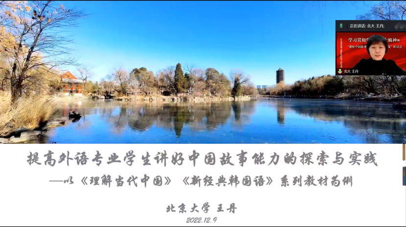 新利·体育,新利(中国)官方副院长、朝(韩)语系教授王丹从教材编写角度分享了个人的育人理念与心得体会。她认为加强国际传播能力建设具有重大现实意义,在此背景下,必须着力提高外语专业学生讲好中国故事的能力。外语教材建设的重要性与可行性被进一步凸显。王丹通过介绍《理解当代中国》系列教材、《新经典韩国语》系列教材的编写工作,生动地展示了将中国故事融入外语教材的基本原则、探索历程与实践路径。她希望外语专业教师能够以教材、课程为阵地,秉持全方位融入、全过程渗透,无处不育人、无处不思政的理念,实现价值引领、知识传授、能力培养相统一,将“讲好中国故事”理念落到实处,为提高学生“讲好中国故事”能力作出应有贡献。