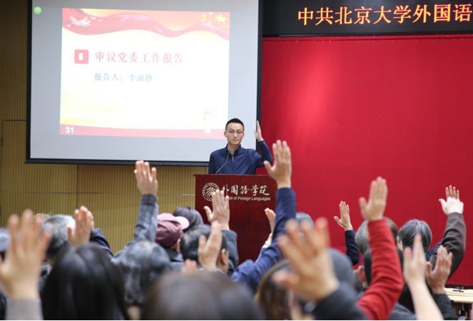 大会在庄严的国歌声中拉开帷幕。王恒同志主持会议。李淑静书记代表上一届党委作题为《凝心聚力促发展,立德树人育桃李》的工作报告。报告从“努力夯实党建工作基础”、“扎实开展专题学习教育”、“协同推进学院整体建设”等三方面总结了学院党委过去十年的工作。过去十年来,学院党员队伍整体素质优良,归口党委领导的党工群团工作都取得了显著成绩。学院党委努力把握好教学科研管理等重大事项中的政治原则、政治立场、政治方向,为学院的立德树人工作提供思想保证、精神动力、舆论支持和文化条件,协同推进学院的整体建设。报告同时指出,新的时期给学院党的工作提出了新的更高要求,在今后的工作中,我们要突出问题导向,以习近平新时代中国特色社会主义理论为指导,在北京大学党委的坚强领导下,多渠道加强思政工作,提高党建工作创造性,以改革精神推进党建,为促进学院和谐、推动科学发展尽职尽力,共启新利·体育,新利(中国)官方新的征程。
