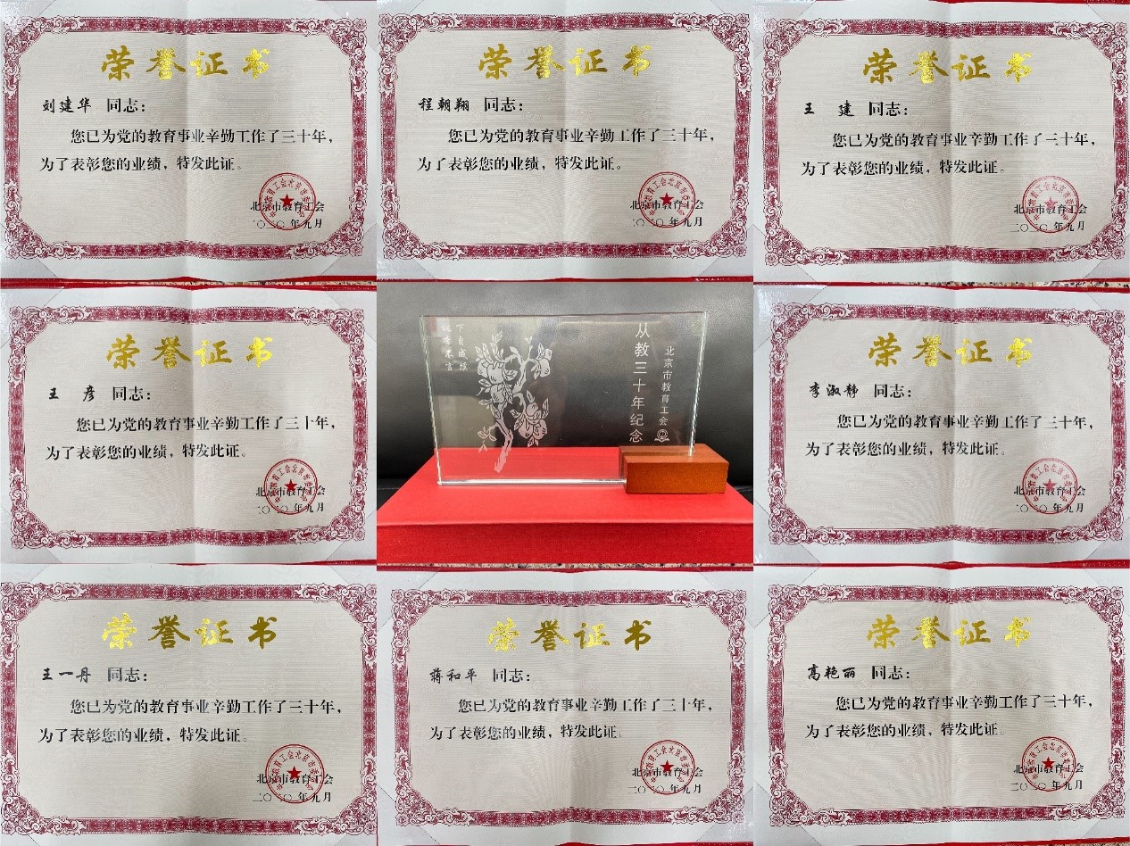 2020年9月第36个教师节之际,我院又迎来一批从教满三十年的老师。他们是英语系刘建华、程朝翔、李淑静、高艳丽老师,德语系王建老师,东南亚系王彦老师,西亚系王一丹老师和阿拉伯语系蒋和平老师,这八位老师已为党的教育事业辛勤工作了三十年,北京市教育工会为他们颁发了表彰证书与纪念章。