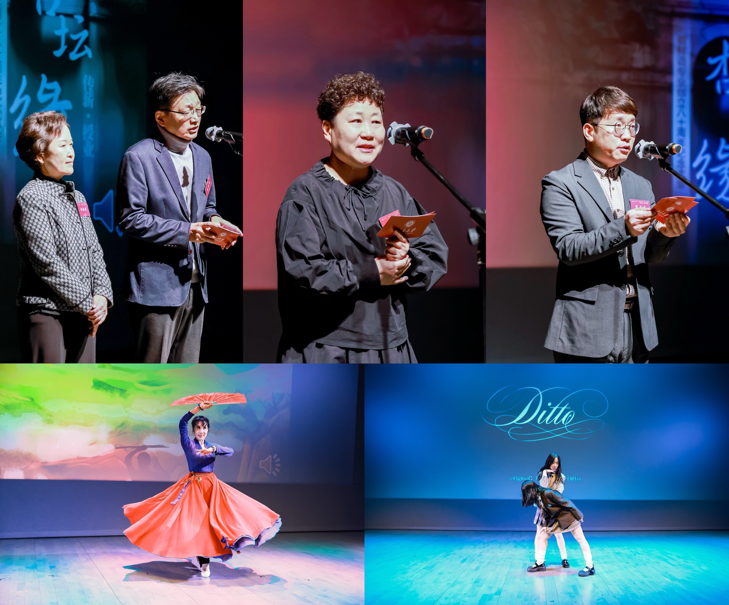 讲述环节结束后,退休教师张敏带来了朝鲜铿锵舞表演。她以优美的舞步,淋漓尽致地展现了朝鲜舞蹈的力与美,赢得了全场的热烈掌声与连声喝彩。随后,25级本科生孙钰婷、田尔诺表演了青春洋溢的韩国现代流行舞。师生两代人精彩纷呈、充满活力的表演将纪念大会的氛围推向高潮。