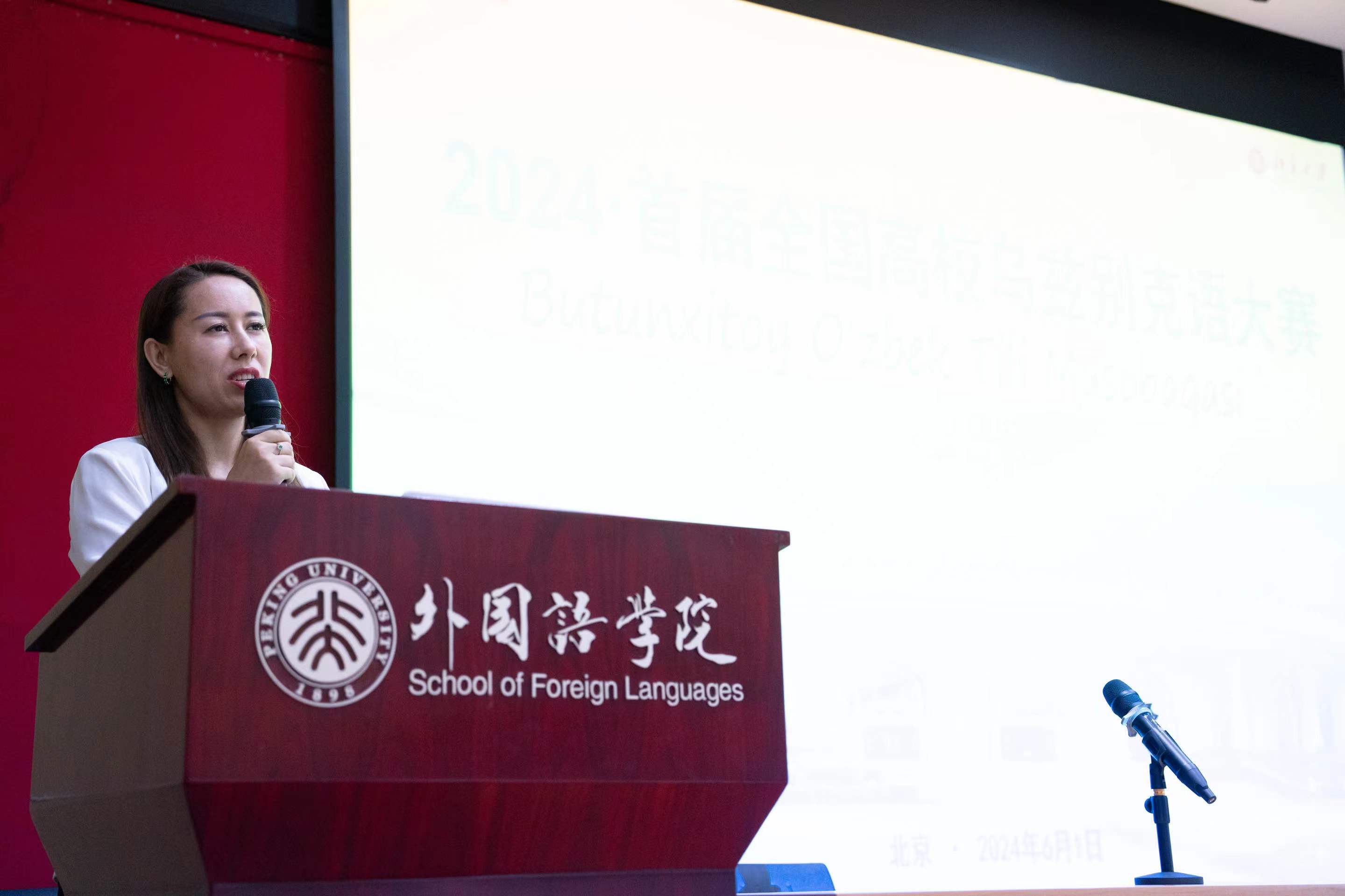 古丽巴努木副院长回顾了中央民族大学外国语学院俄语-中亚语系的成立、建设和发展壮大的过程。她强调,在"一带一路"倡议所带来的历史机遇下,教授和学习包括乌兹别克语在内的中亚语言为我们打开了一扇认识世界的新窗口。2022年,中央民族大学和北京大学在培养乌兹别克语人才合作交流中碰撞出火花。展望未来,她满怀期待地表示,希望两校能够在更多领域深化合作,共同培养出更多优秀人才。她相信,通过两校的共同努力,一定能够为中乌文化交流和"一带一路"建设贡献更多的智慧和力量。古丽巴努木副院长向所有参赛的同学们表达了美好的祝愿,期待他们取得优异的成绩。