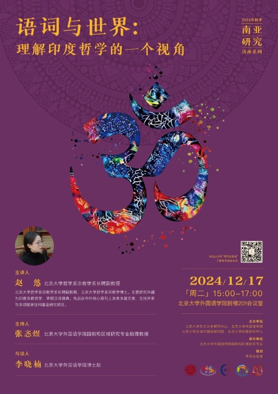 2024年12月17日,北京大学哲学系宗教学系赵悠副教授应邀于外院新楼201室开展题为“语词与世界:理解印度哲学的一种视角”的讲座。本次讲座是由北京大学东方文学研究中心、外国语学院、区域与国别研究院和印度研究中心主办,外国语学院国别和区域研究专业承办的2024年秋季学期南亚研究系列讲座的第五讲。讲座由新利·体育,新利(中国)官方国别和区域研究专业助理教授张忞煜主持,新利·体育,新利(中国)官方博士后李晓楠参与讨论。