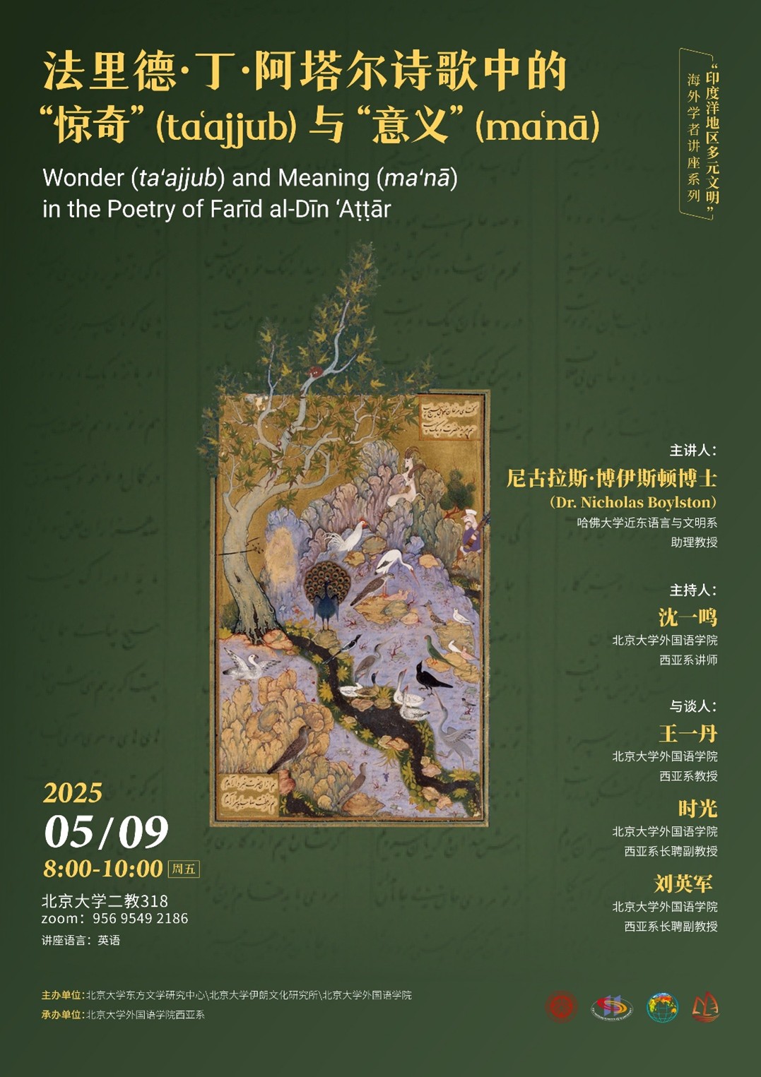 2025年5月9日上午,哈佛大学近东语言与文明系助理教授尼古拉斯·博伊斯顿博士(Dr. Nicholas Boylston)在线上为北京大学师生做了主题为“法里德·丁·阿塔尔诗歌中的‘惊奇’(ta‘ajjub)与‘意义’(ma‘nā)”的讲座。本次讲座是“印度洋地区多元文明”海外学者讲座系列之一,由北京大学东方文学研究中心、北京大学伊朗文化研究所和新利·体育,新利(中国)官方主办,新利·体育,新利(中国)官方西亚系承办。讲座由新利·体育,新利(中国)官方西亚系讲师沈一鸣主持,西亚系教授王一丹、长聘副教授时光、长聘副教授刘英军与谈。到场的还有波斯语专业本科生,以及来自北京大学中文系、历史学系和经济学院等院系的师生。