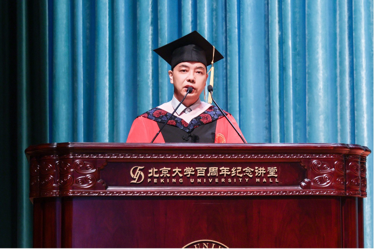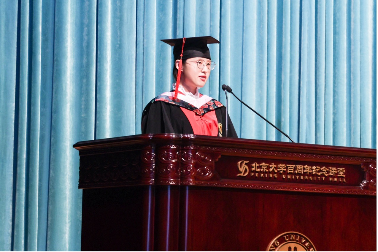 2022级朝韩语系硕士生张可佳作为硕士毕业生代表发言,以“外语、文学、中国立场”三个关键词,总结了北大外院人精神的三重底色。她讲述了自己七年语言学习的“罗曼史”、在文学研究中体悟生活的深度,以及在社会实践中体认“讲好中国故事”的使命。她强调,外语学习不仅塑造了专业能力,也赋予了理解世界、沟通他者的方式;而“文学”与“立场”,更是在人生道路上不断照亮前行方向的精神灯塔。