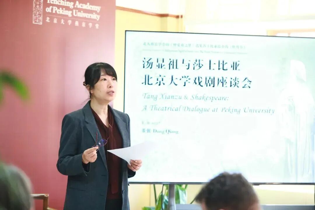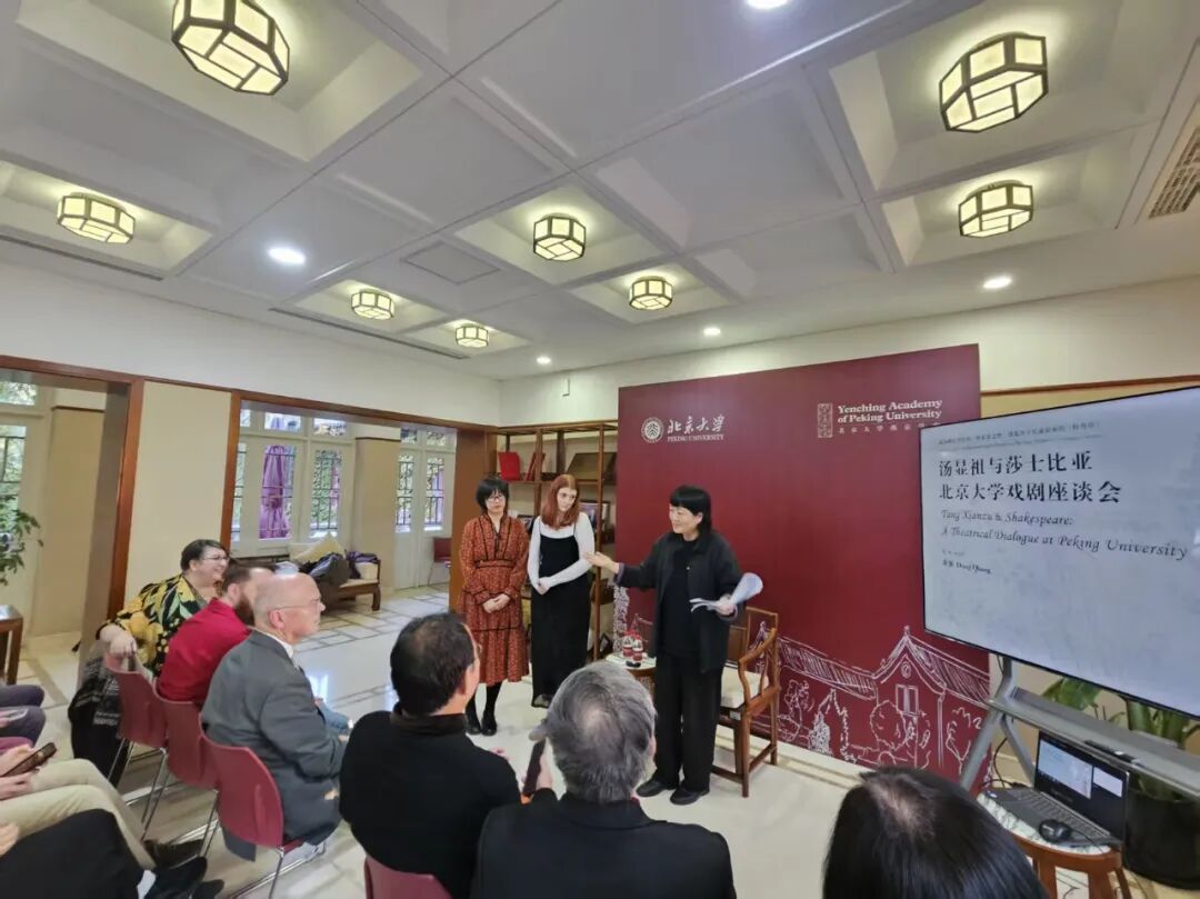 从南京专程赶来参加这次研讨会的从丛教授是国际莎士比亚大会的咨询委员。从教授代表这次活动主办方之一的南京大学高研院莎士比亚中心发言。她首先向北大外国语学院和北大燕京学堂致谢。她援引来访的道布森教授的文章《莎士比亚与空间:斯特拉福、伦敦、考文垂》,阐释了此次活动的深远意义:正如四百年前伦敦莎士比亚剧团巡演于斯特拉福、考文垂等地及牛津、剑桥等学府,这次来自莎翁故乡的师生团队,在汤显祖故里抚州以莎剧诗体演绎《牡丹亭》后,又来到北京和北大,堪称一场跨越时空的"汤莎文化空间旅行"。她还用黄必康教授文本中的两个译例,具体说明莎体《牡丹亭》译本"莎句挪用""读者友好""文化适配"等翻译策略在跨越文化空间上的精妙之处。当杜丽娘饰演者吴悦琪与春香饰演者科尔斯蒂•法罗应邀现场示范时,观众得以直观感受这些译法如何巧妙化解语言和文化障碍——或达到英语观众能够会心一笑的“喜剧效果”,或彰显直抵人心的“悲剧张力”——实现汤莎戏剧跨文化的当下共鸣。