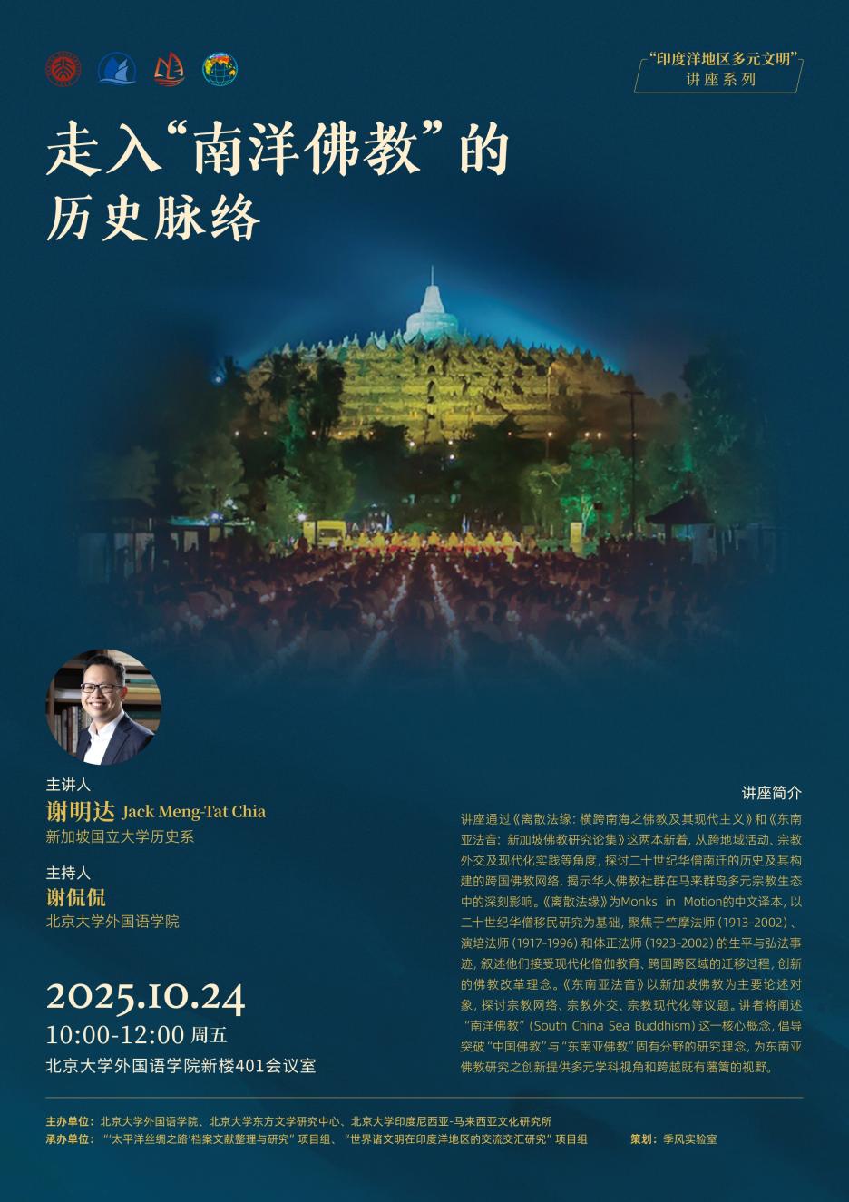 2025年10月24日上午,新加坡国立大学历史系副教授谢明达(Jack Meng-Tat Chia)应邀在新利·体育,新利(中国)官方新楼401会议室举行题为“走入‘南洋佛教’的历史脉络”的学术讲座。谢明达老师是英国皇家历史学会会士,目前在新国大担任福海佛教研究讲座研究员兼人文及社会科学学院助理院长。