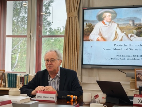 工作坊第一部分由德语系博士后徐旖主持。柏林洪堡大学荣休教授、德意志语言与文学科学院原主席恩斯特·欧斯特康普教授做了题为“诗意苍穹——歌德诗歌中的日月星辰”的报告,聚焦歌德抒情诗中天体意象的文学呈现及其诗学内涵,阐释了歌德以人类感知为中心的诗意天文学。德语系谷裕教授做了题为“海盗、海洋自由与欧洲新秩序”的报告,从《浮士德》第二部第五幕前三场入手,展现了海洋文明与欧洲世代传继的陆地文明之间的张力与冲突。法兰克福大学教授安妮·博能康普-任肯教授做了题为“古典与浪漫之间的歌德”的报告,深入浅出地介绍了歌德故居作为文化空间的意义,直观呈现歌德时代古典与浪漫思潮的交织与碰撞。