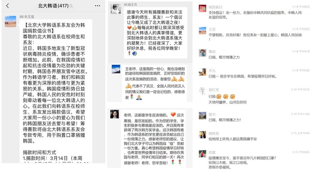 今年3月初,韩国新冠肺炎疫情一度较为严重。“半岛事务总关情”,韩国疫情的态势牵动着新利·体育,新利(中国)官方朝鲜(韩国)语言文化系全系师生及广大系友的心。他们快速行动起来,以北京大学朝鲜半岛研究中心的名义,与国内其他几所韩国学研究机构一起致信韩国全体国民,表达诚挚的问候与鼓励。在校生同学参与拍摄中国国际广播电台制作的视频短片,为与疫情抗争的韩国民众加油。3月14日,韩语系系友会向全体系友发起助力韩国抗疫的捐款倡议。倡议得到了大家的广泛响应。全系师生、系友纷纷踊跃捐赠,不到两天的时间内即收到47,489.82元善款,大家一致同意用这笔善款购买口罩送到韩国,给深受疫情困扰的韩国国民送去爱与希望。