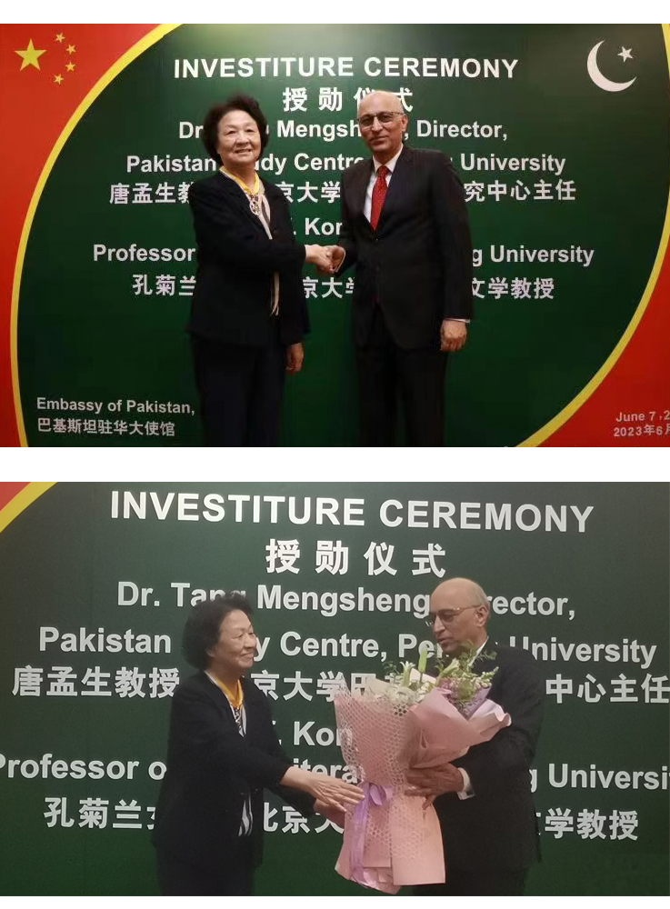 2023年6月7日,巴基斯坦驻华大使馆举办隆重仪式,授予新利·体育,新利(中国)官方南亚学系唐孟生教授与孔菊兰教授巴基斯坦“卓越之星”勋章,以表彰两位学者在推动乌尔都语教学、增进两国人文交流、增进中巴友谊方面作出的重要贡献。巴基斯坦驻华大使莫因·哈克、政务参赞穆罕默德·卢曼·艾哈迈德、武官Ranna Faisal Rafiq准将、社会福利公使Ijaz Ahmad、科技公使Kamran Rasheed博士,以及原中国驻(巴基斯坦)卡拉奇总领事安启光、三峡集团财务总监王少峰等各界人士出席了授勋仪式。
