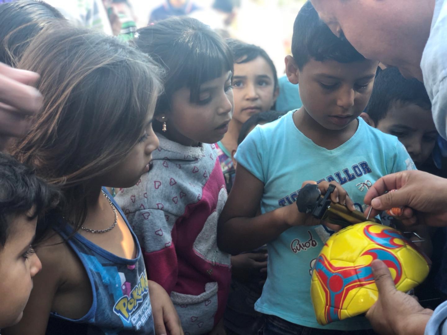 付老师为孩童发放足球